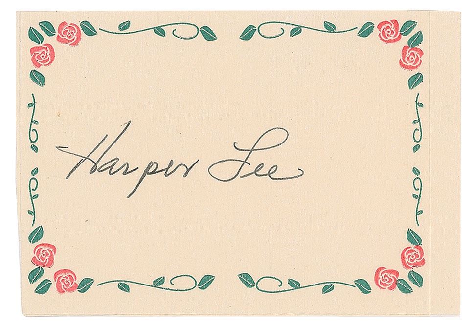 Ink signature, "Harper Lee,” on an unused off-white 4.25 x 3 bookplate with floral border. In very fine condition.