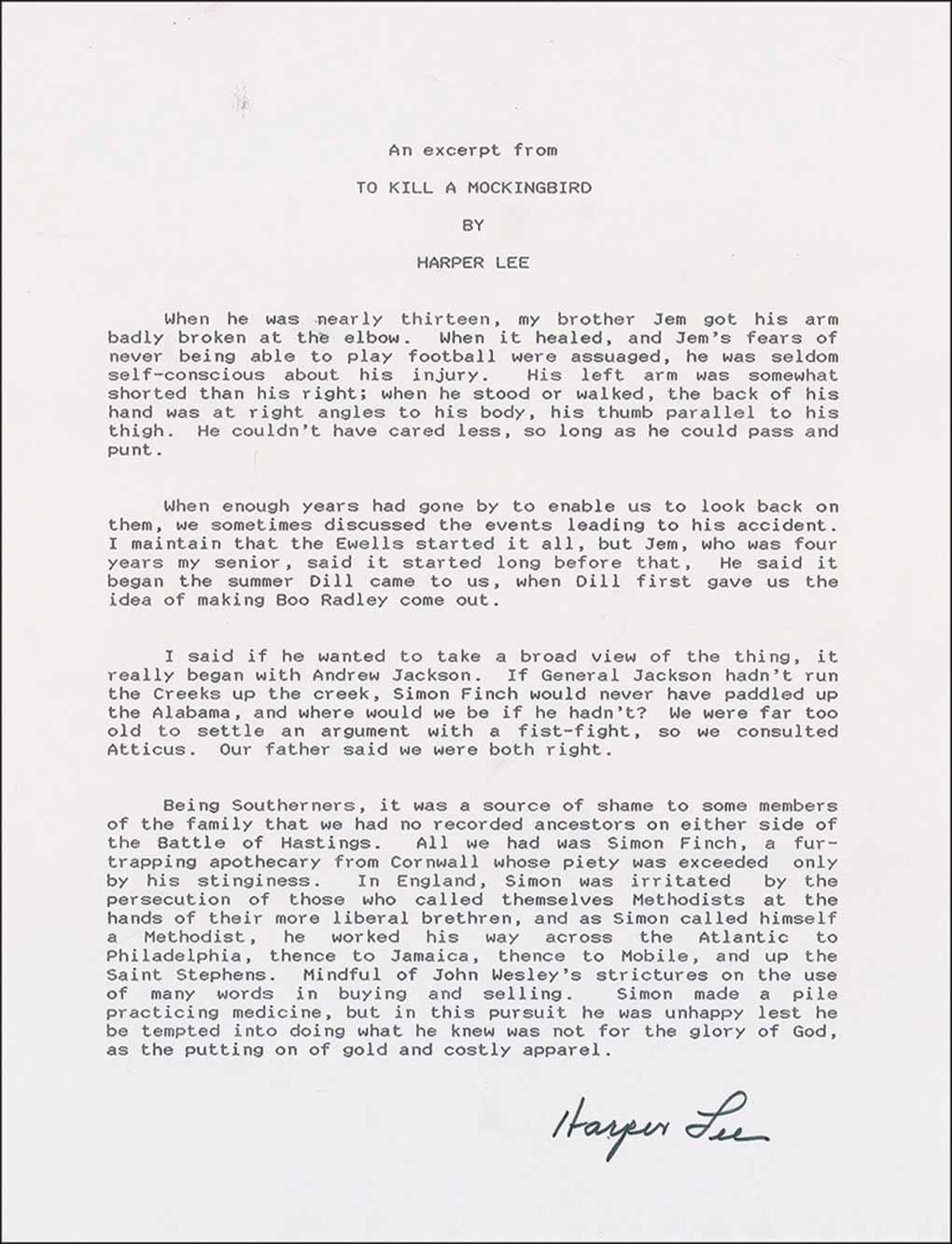 Souvenir typed excerpt from her classic To Kill a Mockingbird on a plain white 8.5 x 11 sheet. The beginning of Chapter One, in part, “When he was nearly thirteen, my brother Jem got his arm badly broken at the elbow. When it healed, and Jem’s fears of never being able to play football were assuaged, he was seldom self-conscious about his injury.” In very fine condition.