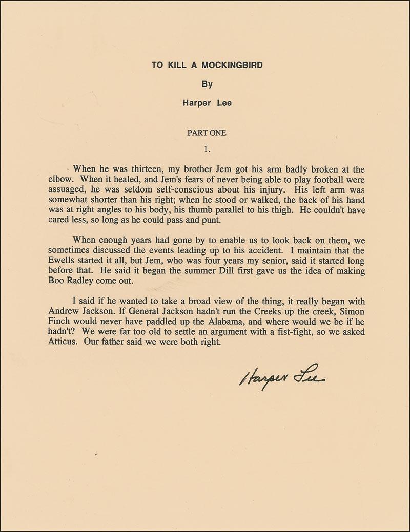 American author (born 1926) whose first—and still only—novel, To Kill a Mockingbird, won the Pulitzer Prize in 1960 and went on to become one of the most beloved classics of the twentieth century. Souvenir typed excerpt from her classic To Kill a Mockingbird on a creamy 8.5 x 11 sheet. The beginning of Chapter One, in part, “When he was thirteen, my brother Jem got his arm badly broken at the elbow. When it healed, and Jem’s fears of never being able to play football were assuaged, he was seldom self-conscious about his injury…” Signed in black felt tip at the conclusion. In very fine condition. Pre-certified PSA/DNA and RRAuction COA.