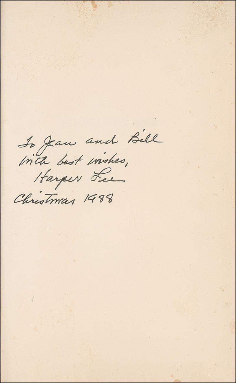 American author (born 1926) whose first—and still only—novel, To Kill a Mockingbird, won the Pulitzer Prize in 1960 and went on to become one of the most beloved classics of the twentieth century. Signed book: To Kill a Mockingbird. First edition (stated explicitly on the copyright page). Philadelphia: J.B. Lippincott Company, 1960. Hardcover with dustjacket, 5.75 x 8.25, 296 pages. Signed and inscribed later on in black felt tip, “To Jean and Bill, With best wishes, Harper Lee, Christmas 1988” on a similarly-sized page which has been inserted and affixed into the front of the volume. The book is in very good condition, with some light staining and creasing to signed page, light soiling and bookplate remnant to first free end page, scattered soiling and wear to covers and spine, and binding a bit loose. The dustjacket shows scattered moderate creasing, heavier to the front, paper loss along spine and edges, and light toning and soiling; its inside flap shows the original price of $3.95 along with Truman Capote’s blurb of praise, and his photo of Lee graces the jacket’s back panel. A rare opportunity to acquire a rare first edition of a modern classic.