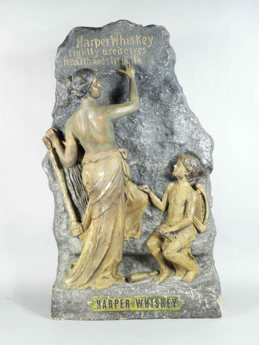 Rare Harper Whiskey Three Dimensional Chalk Display. Entitled, "Harper Whiskey Rightly Used Gives Health and Strength". Some minor paint rubs otherwise very good condition. 17 X 31 1/2 X 7 inches.