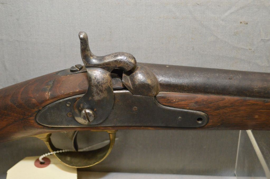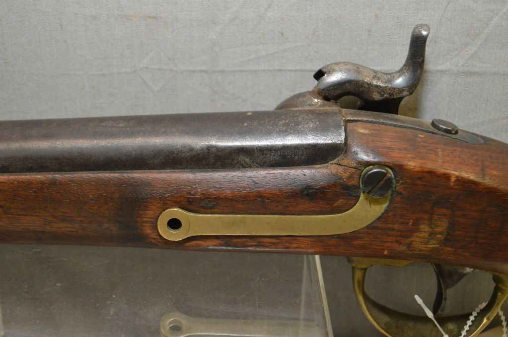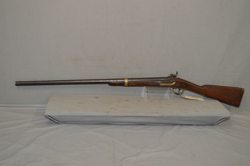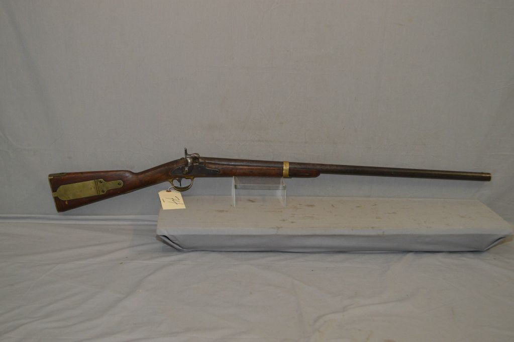 Harper's Ferry Model 1842 U.S. Dated 1845 .69 Perc Cal Half Stocked Musket w/ 32" bbl [ brass band , trigger guard, inlaid patch box, & U.S. marked butt plate, patchy blue finish turning brown, age cracks behind the lock, missing front lock screw & ramrod, left side of barrel marked ? Steel ] Ser # Nil ANTIQUE NO PAL REQ