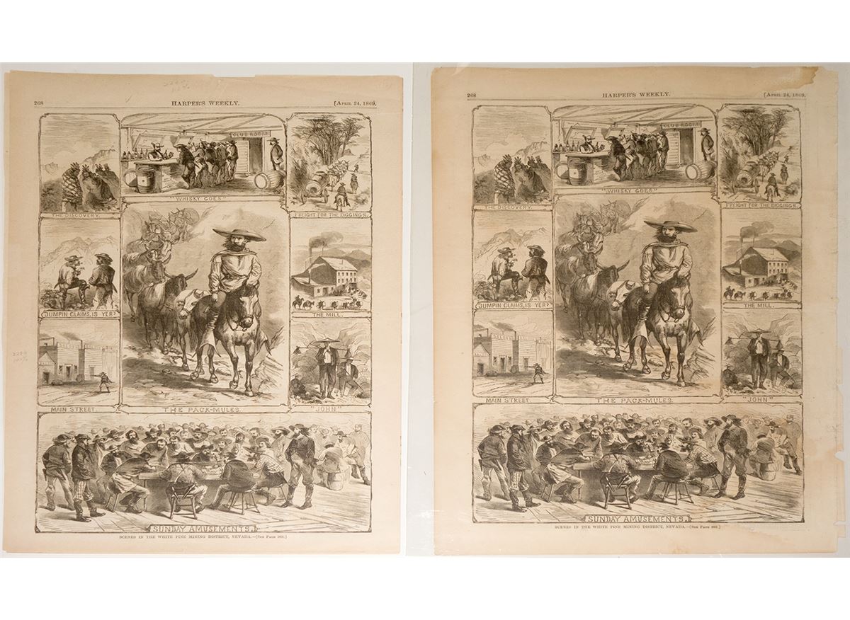 Three pages (one is duplicate) from Harper's, April 24, 1869. One is a news page that discusses the White Pine Mining District in Nevada; the other page is the Sunday amusements page filled with sketches/cartoons of miners.
