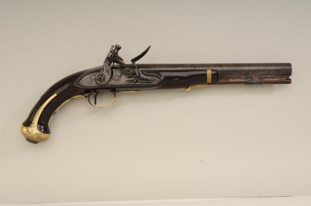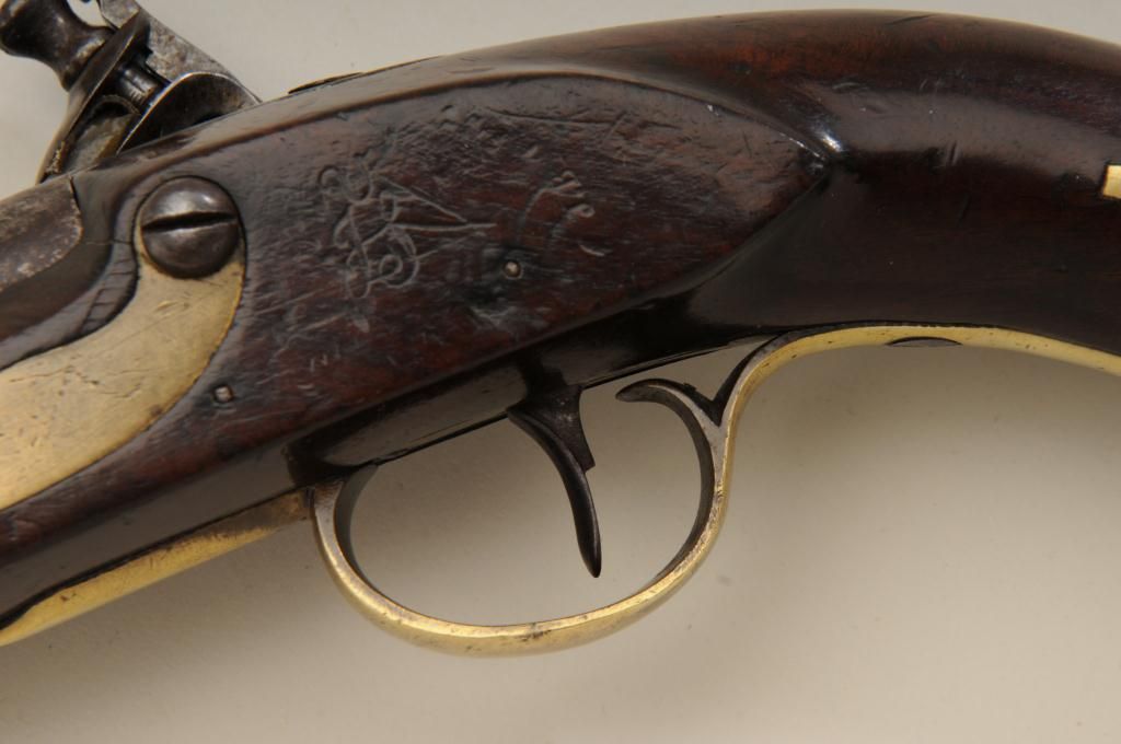 Harpers Ferry Model 1805 flintlock pistol, .54 caliber, 10-1/16” round barrel with iron rib below holding an iron ramrod ferrule, brass mountings, lockplate dated 1808, wood stock, #1833. This rare gun is in overallvery good condition showing a brown patina on metal surfaces with scattered spots of erosion on barrel and light pitting around firing area; sharp spread eagle over US on lockplate and sharp HARPERS FERRY 1808markings; dark bore; good to very good wood stock with very good inspector’s cartouche on left side above trigger, some minor old mars and scratches from carry and storage, an old repair to a chip of wood on the backside ofthe grip that was obviously done long ago. The 1805 was the first military handgun manufactured by a national armory; there were only 4,096 made and they were issued in pairs, therefore the highest serial numberwould be 2,048. Only 1,208 1808 dated specimens were made. A key gun for the U.S. martial collector and one that is extremely hard to find in any condition let alone in this quality. Est.: $11,000-$20,000.