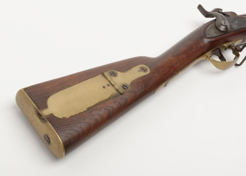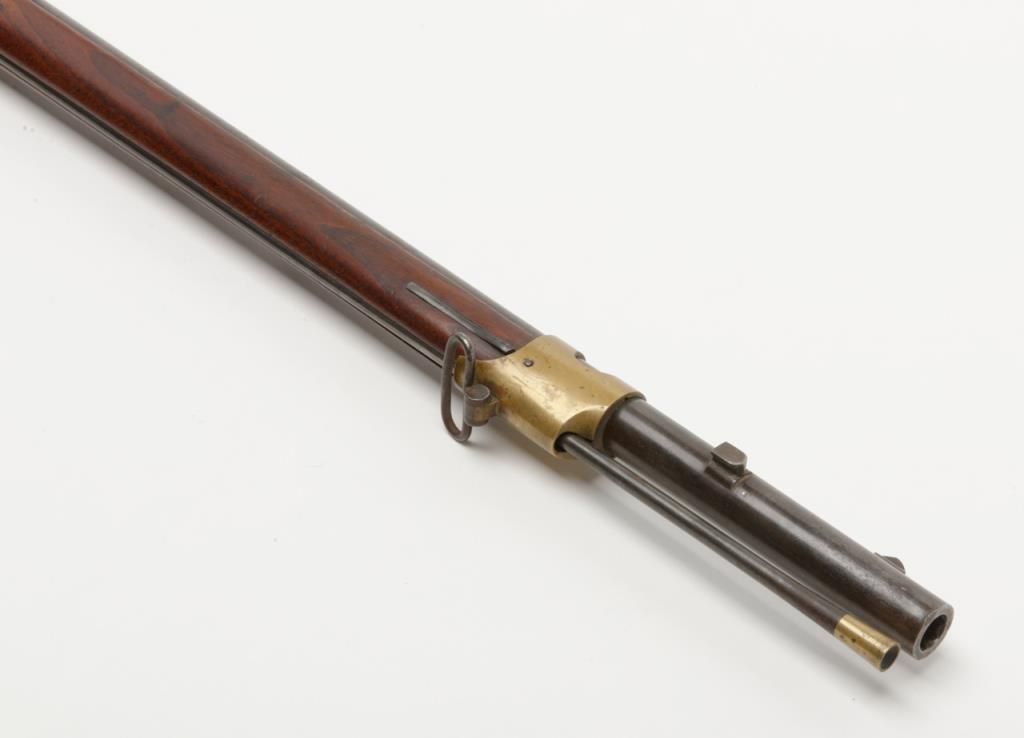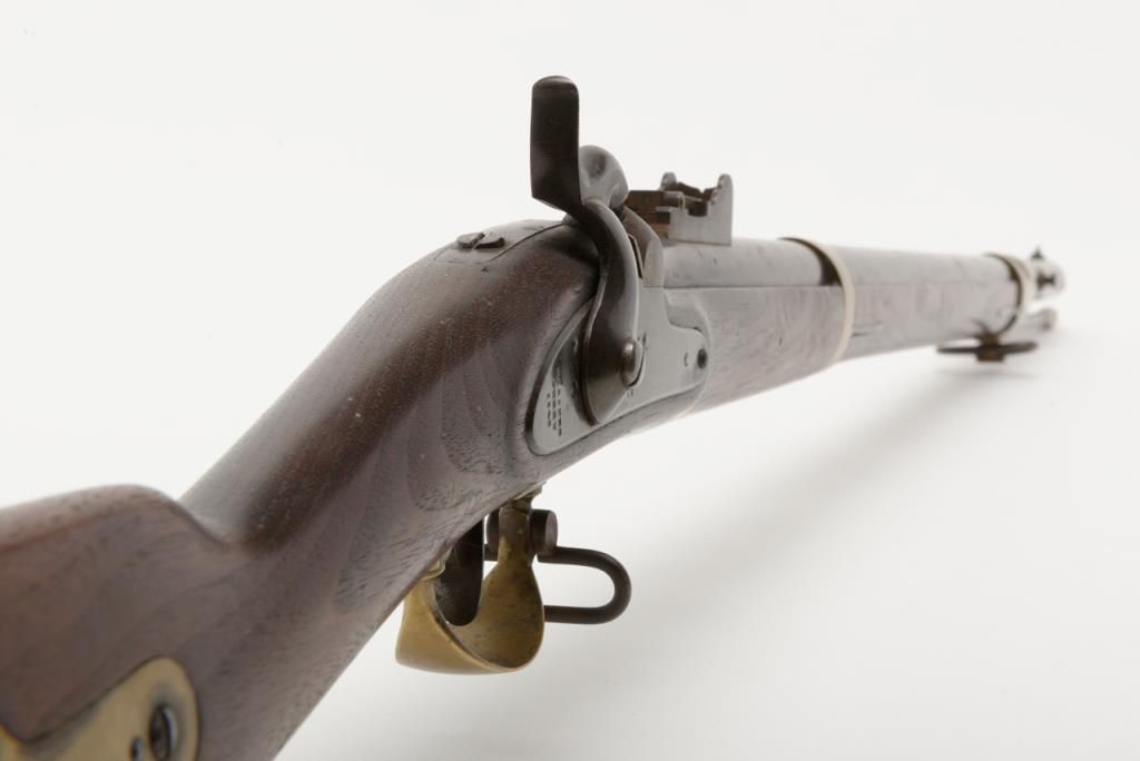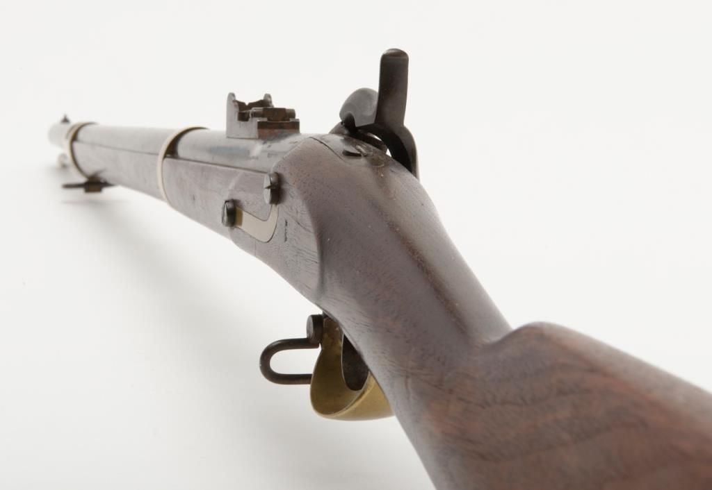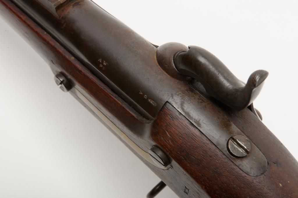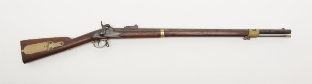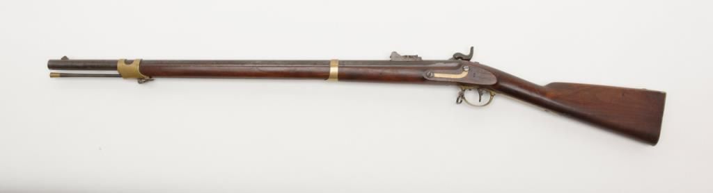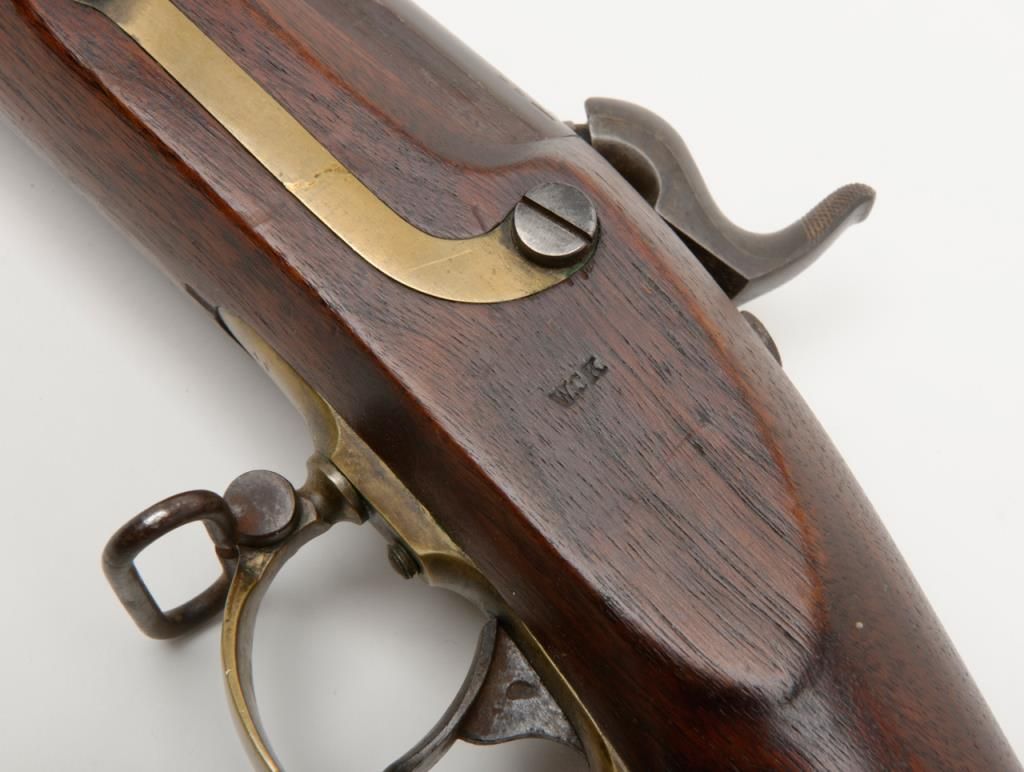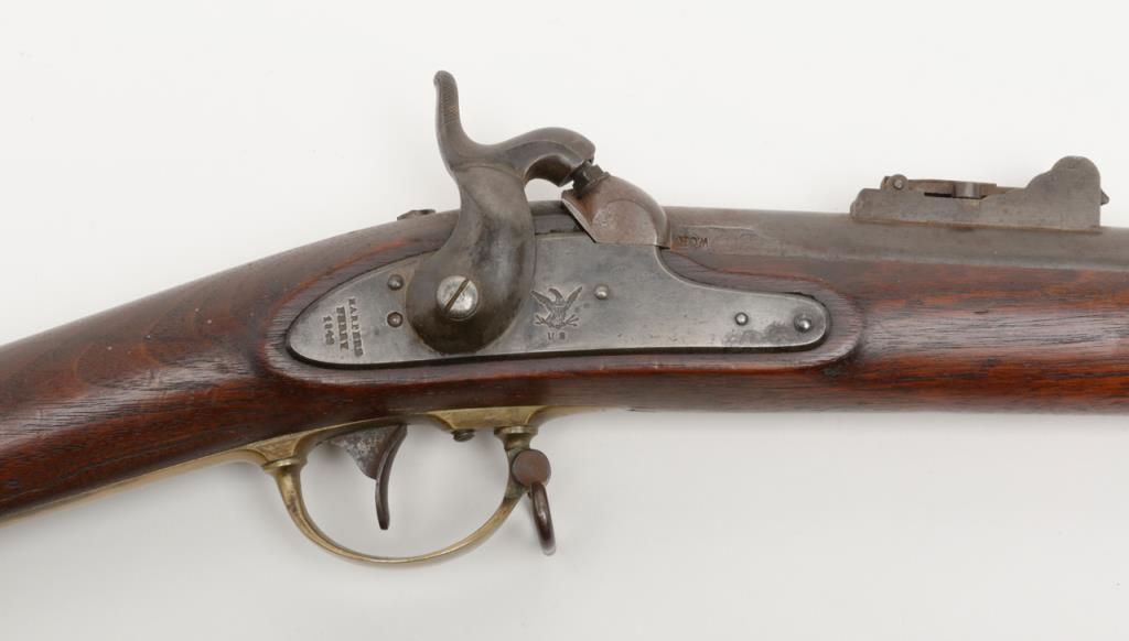 Harpers Ferry Model 1841 Mississippi rifle in .54 caliber with folding long-range style rear sight and mounts for saber bayonet remaining in very good plus original condition. The rifle is dated 1849 on the lock and shows a full complement ofmilitary inspections including W. C. K. who Bill Gary identifies as the Adjutant General William C. Kibbe of California and he indicates ownership by the state of California in 1849 during the goldrush. The inventory card further states thatthis rifle was obtained in 1939 from Bannerman’s by William A. Gary. The barrel shows 40% to 60% original finish going to patina with some minor beginning rust and slight erosion. The lock is sharp with strong traces of case hardening goingto a gray. The stock is very good plus to near fine with sharp edges and no appreciable losses along the sides of the ramrod channel. The stock is well marked with W.C. K. behind the side plate and no other marks or proofs. There is an extranipple within the patch box and an original to the period ramrod is retained. The Eagle marking on the lock are super sharp and the rifle is very crisp overall. William A. Gary collection consigned by his estate Est.: $5,000-$10,000