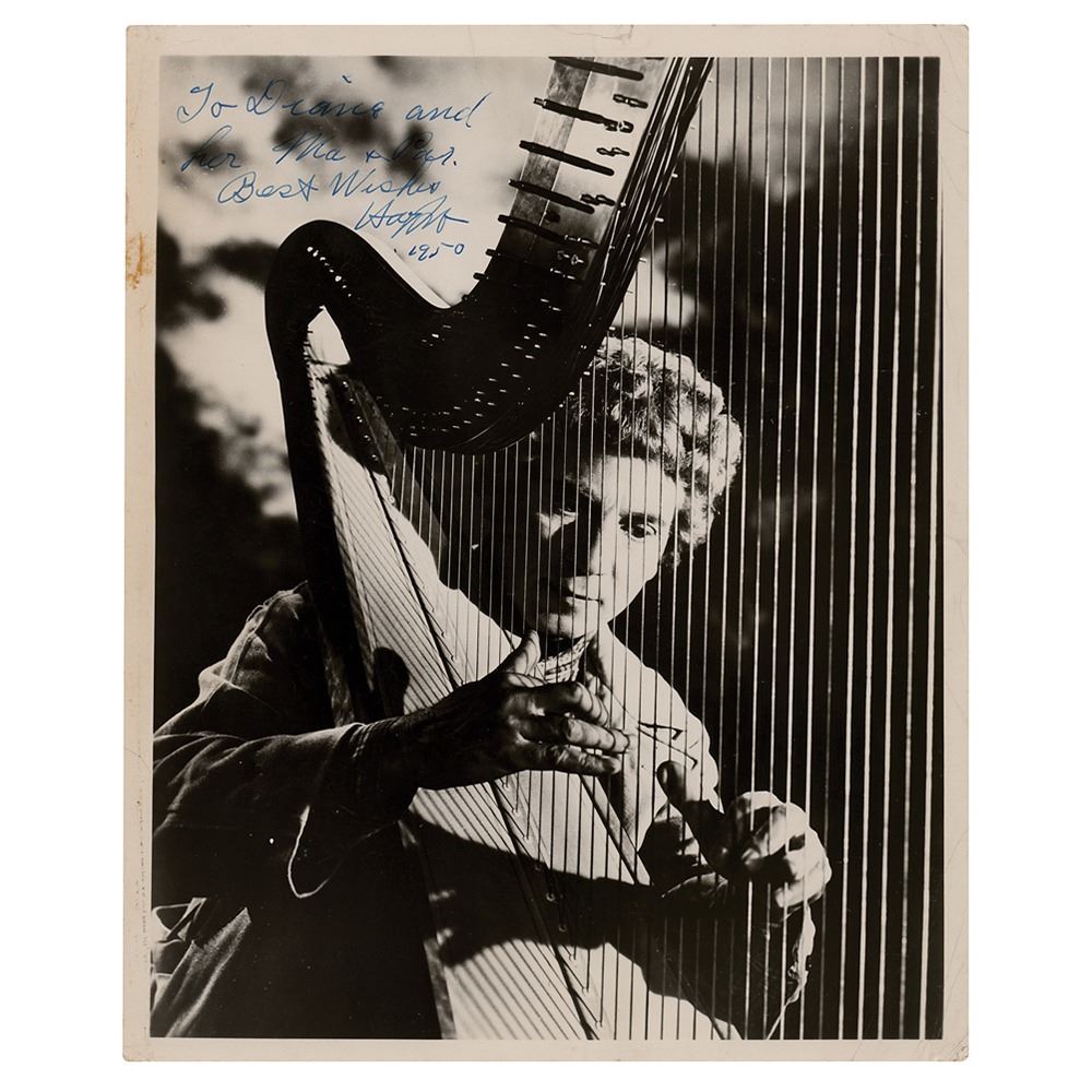 Humorous vintage glossy 8 x 10 photo of Harpo Marx playing a huge harp, signed and inscribed in fountain pen, "To Diana and her Ma & Pa, Best Wishes, Harpo, 1950." In very good condition, with overall creasing and a small tear to the top edge.