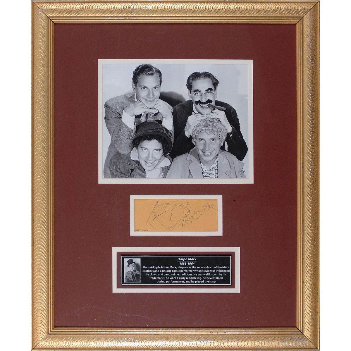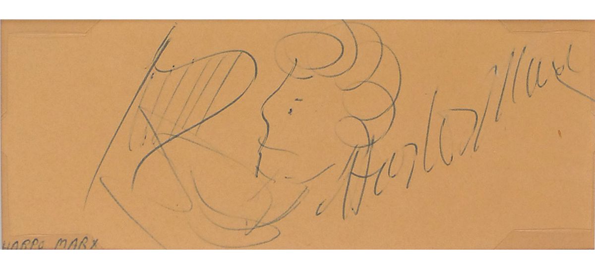 Original vintage signed ballpoint portrait of himself playing a harp on a beige 5.25 x 2 album page. Double-matted and framed with an unsigned photo of the Marx Brothers and biographical plaque to an overall size of 18.5 x 22.5. In fine condition. Accompanied by a full letter of authenticity from JSA.