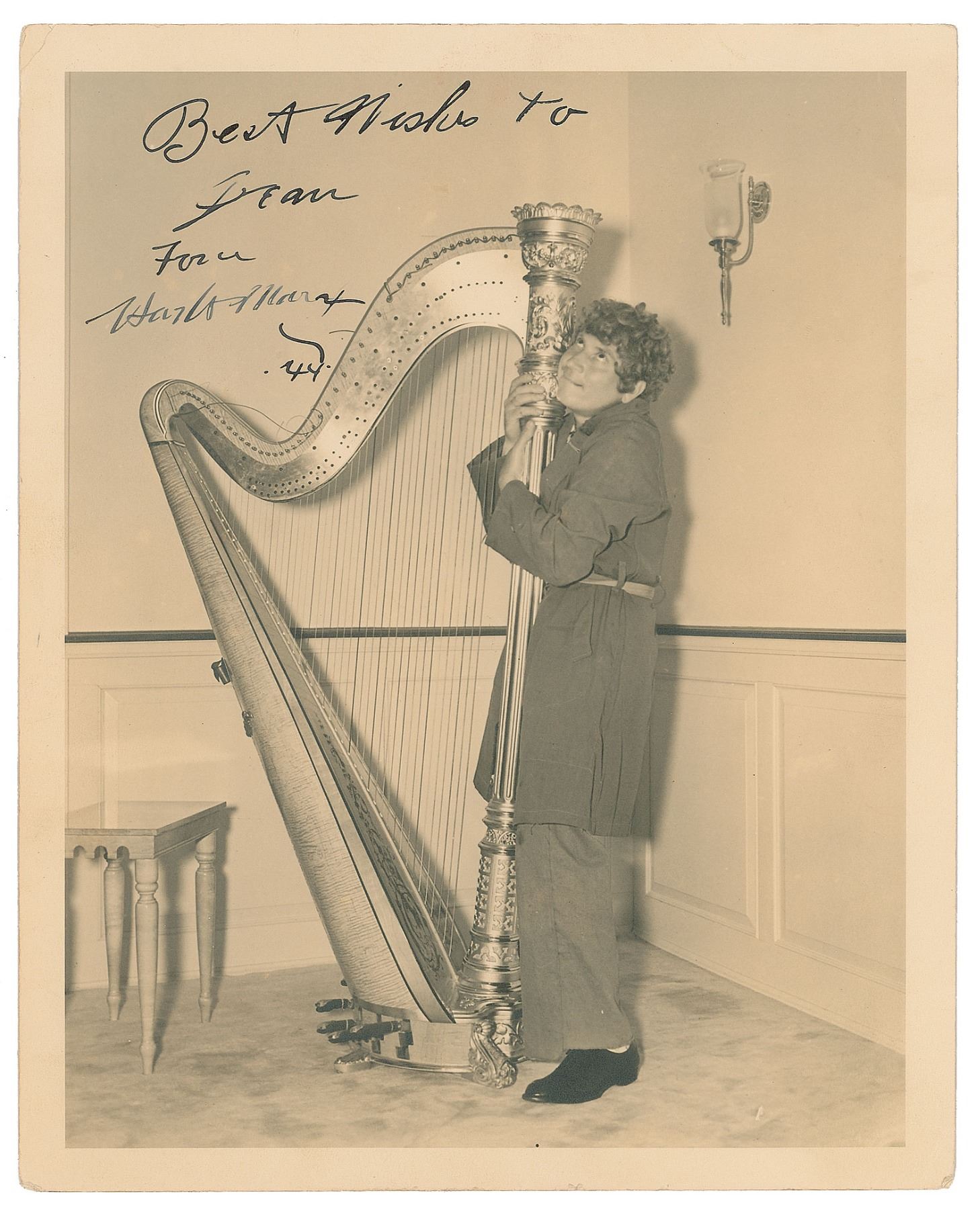 Vintage matte-finish 8 x 10 full-length studio portrait of Marx embracing a large harp, signed and inscribed in fountain pen, "Best wishes to Dean, from, Harpo Marx, '44.” Reverse of photo bears an MGM/Graybill credit stamp. In fine condition, with a small crease to the upper left corner tip.