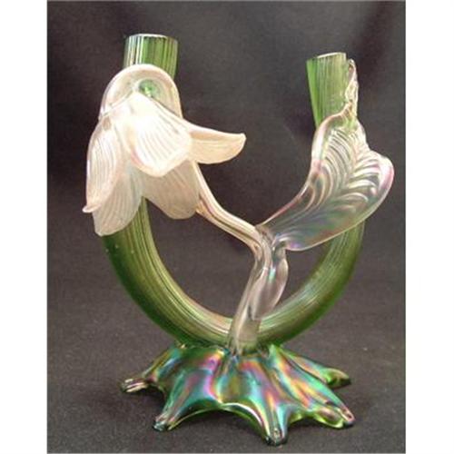 </font></strong>A very beautiful and delicate double neck vase with a maximum height of 6 1/2". It is 5" across. It has a large five pedal irridescent crystal flower with a continuation of stem and large leaf that is attached to both tubes and the base. The base has a strong irridescent luster of different colors. This piece was made by Harrach, Ca. 1900. A similar piece can be found in Truitt's Bohemian Glass Book - 1880 - 1940, on page 63, item three. This piece is perfect and a real eye-catcher. No damage.</font>