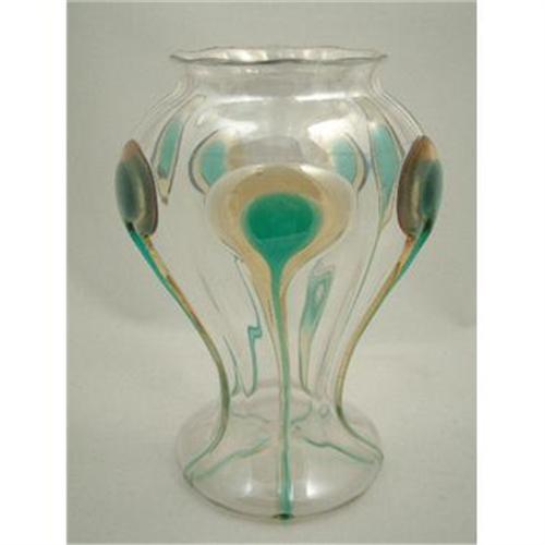 This is Ca. 1900. It is of a bulbous body, with a slim rim that is rolled smooth. It has five 7" peacock eyes that thin out into a slender stream of two-color glass that go right underneath the vase and stops at the polish pontil. Beautiful condition.
