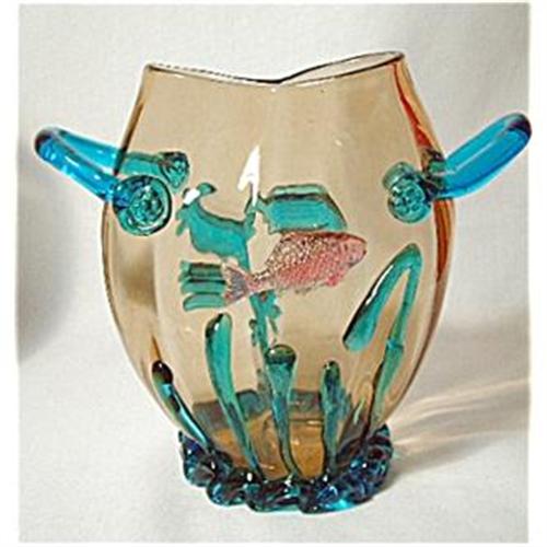 This is a very unusual vase made by Harrach. Not signed, but the color and style indicates Harrach. Could also be made by Moser. Two different scenes. One fishin blue and one a rose pink. Double handles that stick out with glass prunts on both sides. The vase is about 3"" in width and is 7 1/4"" tall. It is 7 1/2"" from handle tip to handle tip. The fish are approximately 2 1/2"". There is a large polish pontil. This is Ca. 1890's. Appropriate age wear on the bottom. No damage.