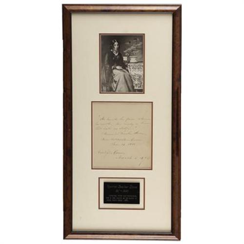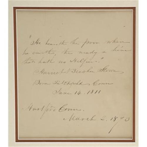 <B>Harriet Beecher Stowe Autograph Document Signed</B></I>. One page, 8” x 9.25”, March 2, 1893. Harriet Beecher Stowe (1811-1896), noted abolitionist and author of <I>Uncle Tom’s Cabin (</B></I>1852), writes in full: <I>“ ‘He heareth the poor when he crieth, the needy and him that’s hath no helper.’ / Harriet Beecher Stowe, / Born Litchfield, Conn / June 14, 1811 / Hartford Conn, March 2, 1893”</B></I> The document is double-matted and framed with a 6” x 8” photograph of Stowe and a small presentation plaque. The document is in very good condition with slight fading.<BR><BR><b>Shipping:</b> Books & Catalogs (<a target="_blank" href="http://www.heritageauctions.com/common/shipping.php">view shipping information</a>)