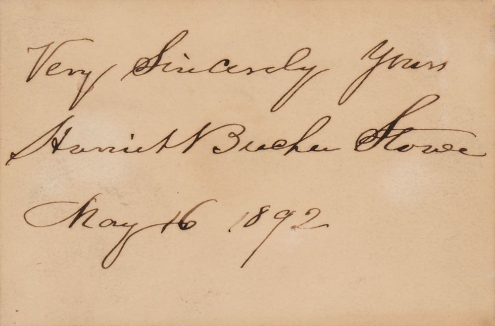 Desirable ink signature, "Very Sincerely Yours, Harriet Beecher Stowe, May 16, 1892," on an off-white 3.5 x 2.25 card. In fine condition. Accompanied by an unsigned engraved portrait.