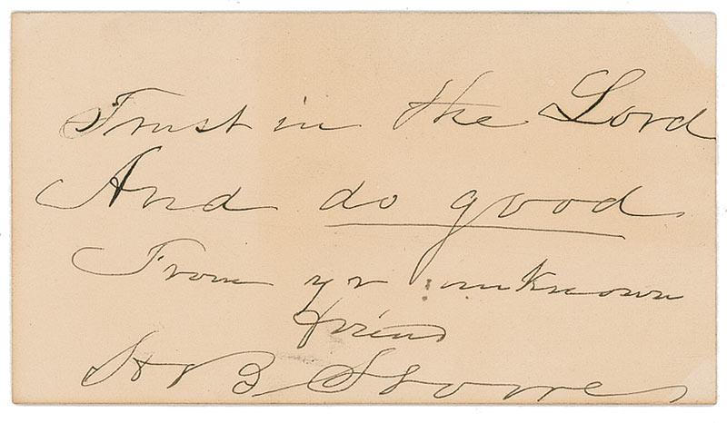 Distinguished author (1811–1896) whose epochal 1852 novel Uncle Tom’s Cabin brought the issue of slavery to the fore of American consciousness and became one of the classics of 19th-century literature. AQS, signed “H. B. Stowe,” on an off-white 3.25 x 2 card. Stowe writes: “Trust in the Lord And do Good. From yr. unknown friend, H. B. Stowe.” Mild block of toning over portion of quote, otherwise fine condition.