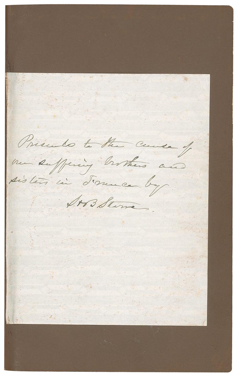 Distinguished author (1811–1896) whose epochal 1852 novel Uncle Tom’s Cabin brought the issue of slavery to the fore of American consciousness and became one of the classics of 19th century literature. Brief notation written on a 4.25 x 5.5 page tipped into the first free end page of Oldtown Folks. In full: “Presents to the cause of our suffering brothers and sisters in Jamaica by H. B. Stowe.” In fine condition, with areas of toning; the book rates very good with some toning to the pages, scattered staining to the boards, and the spine slight loose. Important to note that Stowe's Aunt Mary had been married to a Jamaican planter from whom she fled because of the way that he mistreated his slaves. This inspired Harriet to take up the cause of helping the slaves in Jamaica. A unique sentiment as Stowe takes up a new cause.