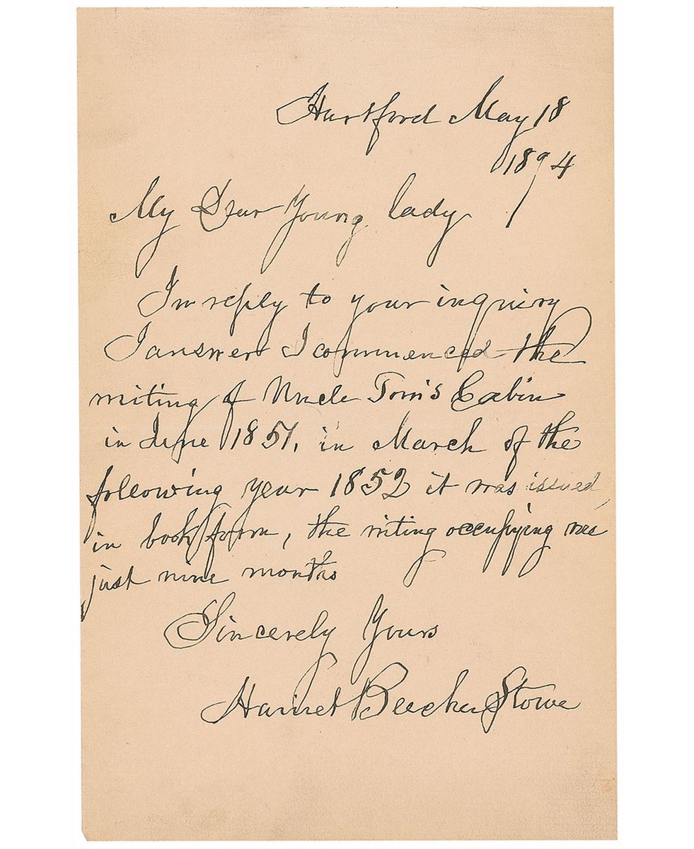 Author and abolitionist (1811–1896) whose novel Uncle Tom’s Cabin brought the issue of slavery to the forefront of American consciousness and became a classic of 19th century literature. Outstanding ALS, one page, 4.5 x 7, May 18, 1894. Letter to an admirer. In part: “I commenced the writing of Uncle Tom’s Cabin in June 1851, in March of the following year 1852 it was issued in book form, the writing occupying me just nine months.” In fine condition. An extraordinarily desirable letter as it is boldly penned and contains a direct reference to her immensely influential book.