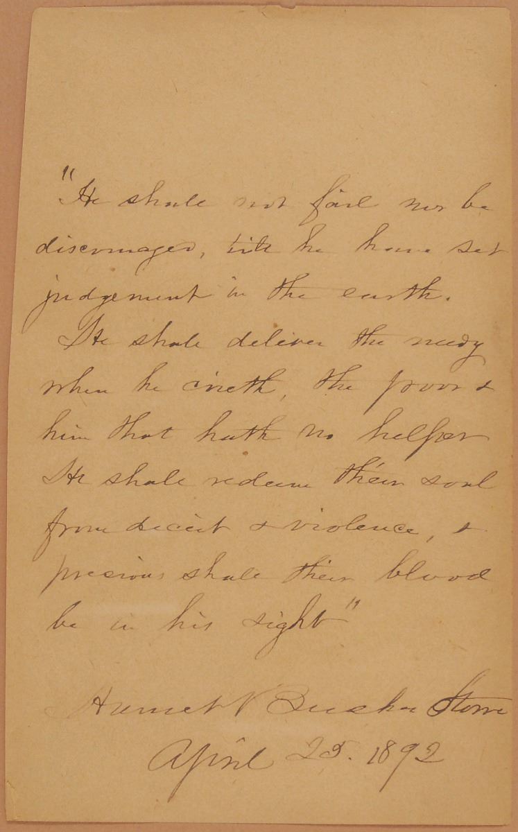 Lengthy AQS on an off-white 4.5 x 7.5 sheet, signed at the conclusion, “Harriet Beecher Stowe, April 25, 1892.” Stowe quotes from the preface of Uncle Tom’s Cabin, in full: “‘He shall not fail nor be discouraged till he have set judgment in the earth. He shall deliver the needy when he crieth, the poor and him that hath no helper. He shall redeem their souls from deceit and violence; precious shall their blood be in his sight.” Attractively double-matted and framed with a portrait of the author to an overall size of 17 x 14. In fine condition, with a slightly trimmed left edge. Quotes from Stowe’s influential canonical work are uncommon and exceptionally desirable.