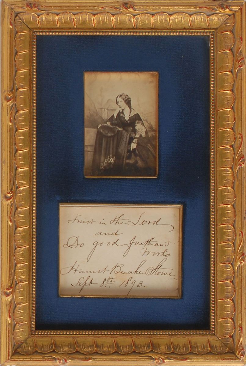 AQS on an off-white 3.5 x 2.5 card, in full: “Trust in the Lord and Do good Faith and Works. Harriet Beecher Stowe, Sept. 8th 1893.” Nicely cloth-matted and framed with a portrait of Stowe. In fine condition, with a few small stains.