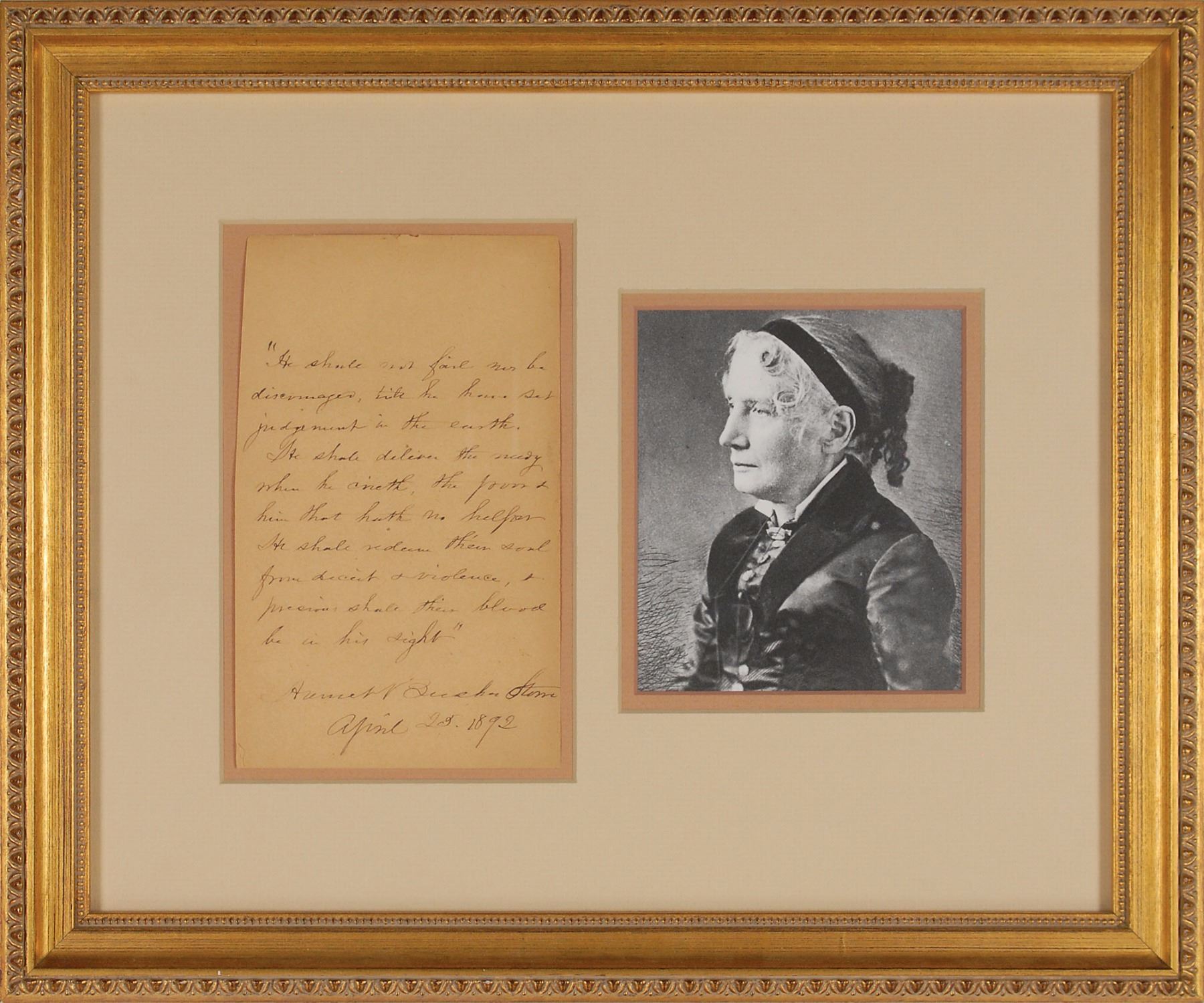 Lengthy AQS on an off-white 4.5 x 7.5 sheet, signed at the conclusion, "Harriet Beecher Stowe, April 25, 1892." Stowe quotes from the preface of Uncle Tom's Cabin, in full: "'He shall not fail nor be discouraged till he have set judgment in the earth. He shall deliver the needy when he crieth, the poor and him that hath no helper. He shall redeem their souls from deceit and violence; precious shall their blood be in his sight." Attractively double-matted and framed with a portrait of the author to an overall size of 17 x 14. In fine condition, with a slightly trimmed left edge. Quotes from Stowe's influential canonical work are uncommon and exceptionally desirable.