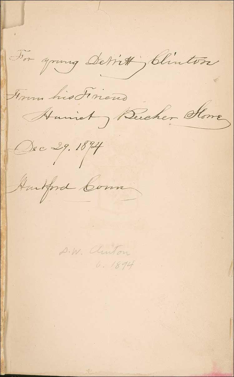 Signed book: Uncle Tom’s Cabin. Later printing. Boston: Houghton Mifflin, 1894. Hardcover with slipcase, 5.25 x 8, 500 pages. Signed and inscribed on the second free end page, “For young DeWitt Clinton, from his friend, Harriet Beecher Stowe, Dec. 29, 1894, Hartford, Conn.” There is a Charles William Clinton bookplate affixed to inside front cover, who was the father of DeWitt Clinton, who died in 1896. In very good condition, with the first two end pages (including the signed page) detached, cracked front hinge, scattered cover wear and soiling, chipping and a light central vertical fold to signed page, some tears, and some light damp staining primarily to the bottoms of pages (the first several dozen pages also show light pink staining within the damp stains, apparently the result of unobtrusive pigment within the front cover). The spine is moderately sunned with wear to its tips. Outstanding association in a notable classic. Pre-certified PSA/DNA and RRAuction COA.