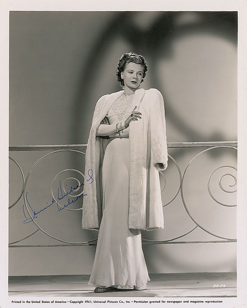Glossy 8 x 10 Universal Pictures publicity photo, signed in blue felt tip. In fine condition, with scattered bends and creases.
