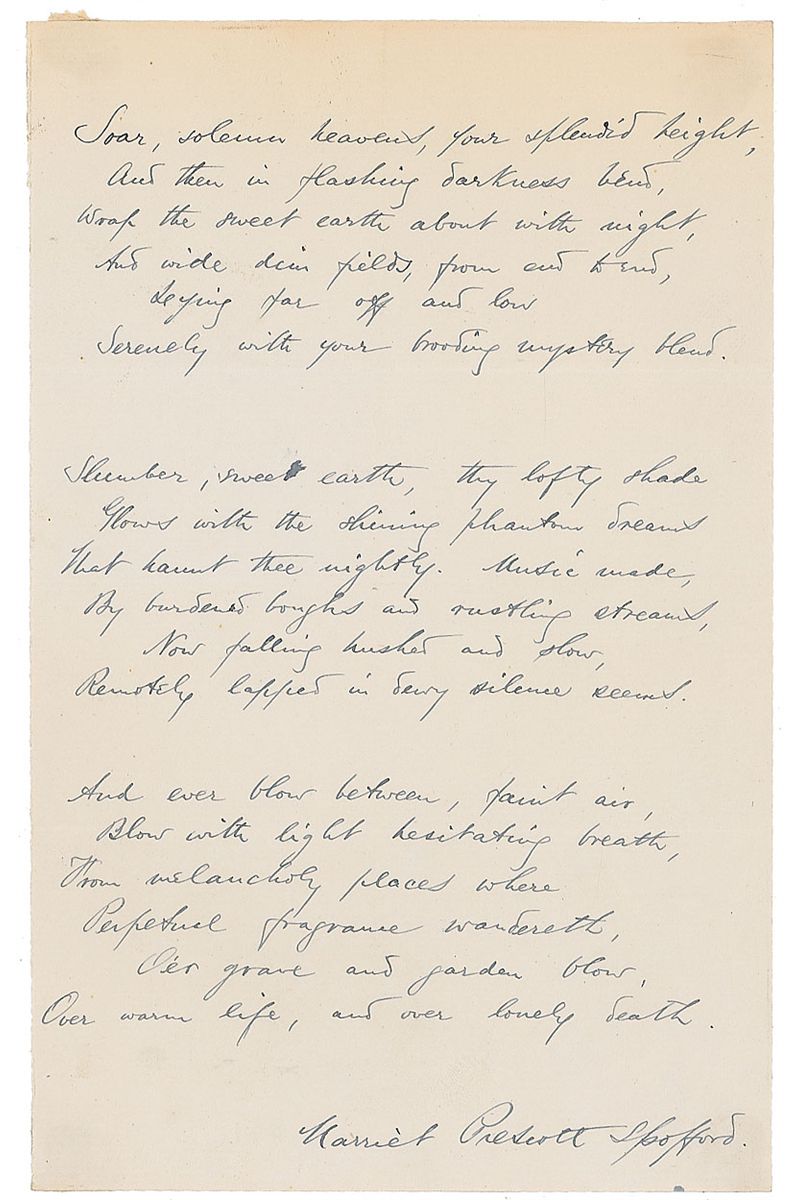 American writer (1835–1921) remembered for her novels, poems, and detective stories. AQS on an off-white 5 x 7.75 sheet. Spofford writes out the first three stanzas of ‘The Violet.’ Beginning, “Soar, solemn heavens, your splendid height, And then in flashing darkness bend, Wrap the sweet earth about with night, And wide dim fields from end to end, Lying far off and low, Serenely with your brooding mystery blend.” Signed at the bottom, “Harriet Prescott Spofford.” In fine condition, with some mild toning to corners from mounting remnants on reverse.