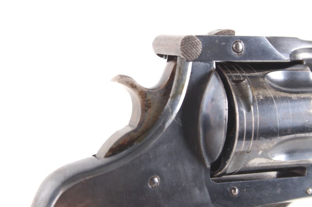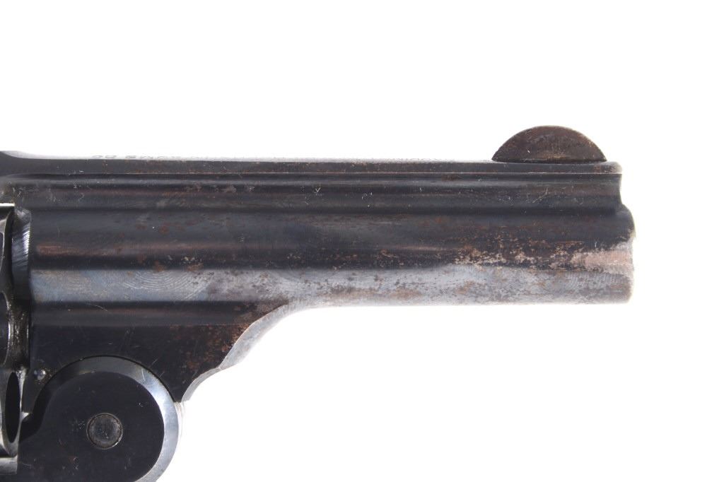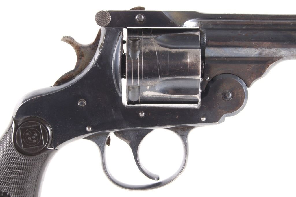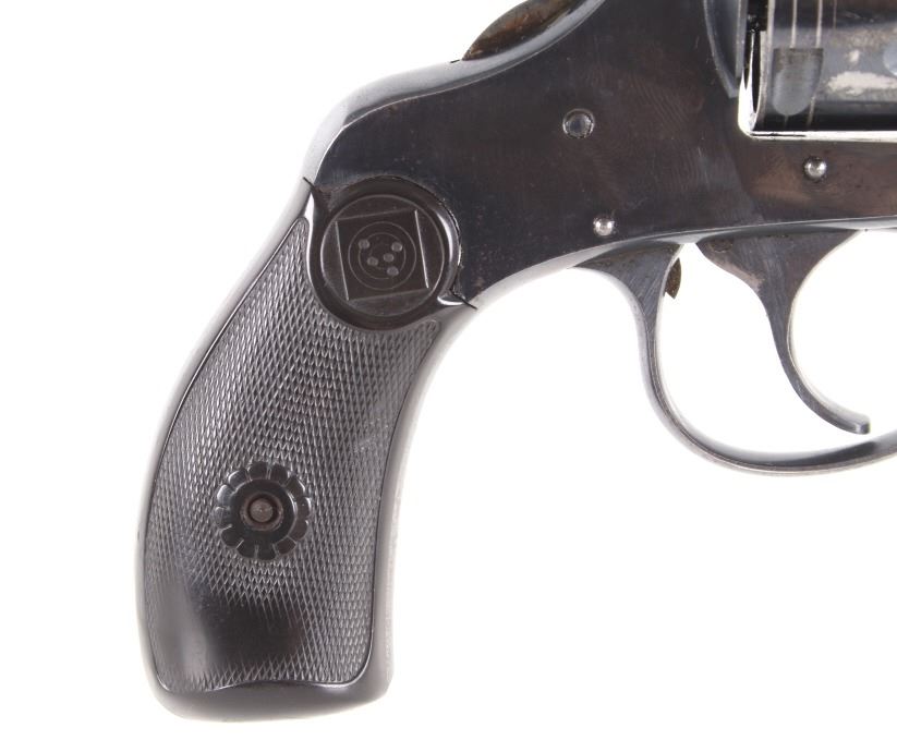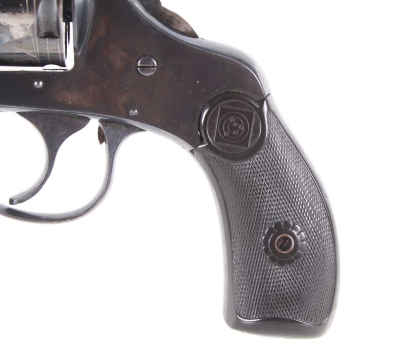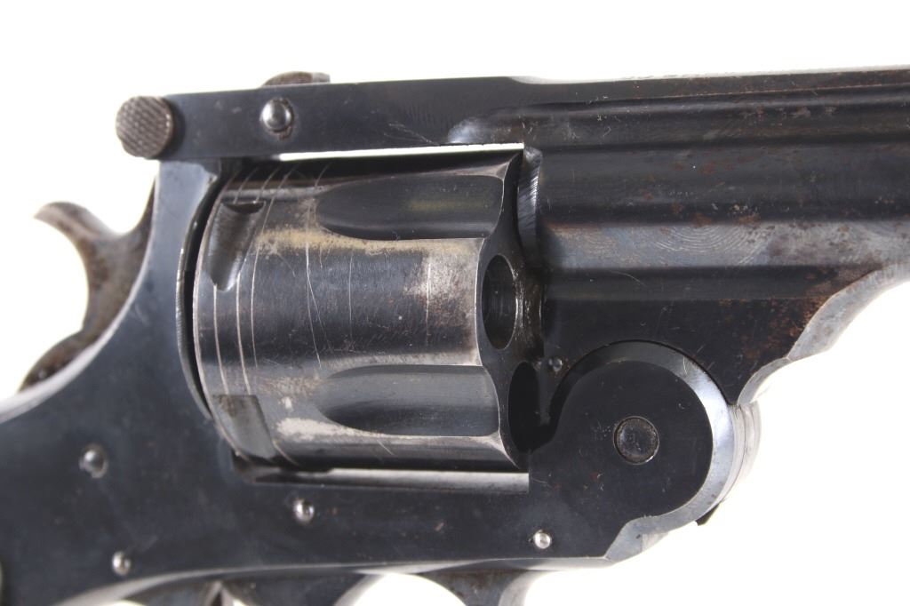 Featured in this lot we have a Harrington & Richardson double action auto ejecting top break revolver chambered in .38 S&W. This revolver displays a 3 1/4" long round ridged barrel, five shot cylinder, double action system, hard rubber grips, top break, and wonderful blue'd finish. The top of the barrel is marked reading "HARRINGTON & RICHARDSON ARMS CO WORCESTER. MASS. U.S.A." with the left side of the barrel reading "38 S.&W. CTGE.". Mechanically the revolver shows a wonderful crisp trigger and smooth cylinder timing. The revolver shows good condition overall with some expected wear due to handling and age. The pistol weighs 1lb. Serial Number: 367909. This firearm qualifies as a Curio & Relic firearm, and requires FFL Transfer or NICS Background Check.