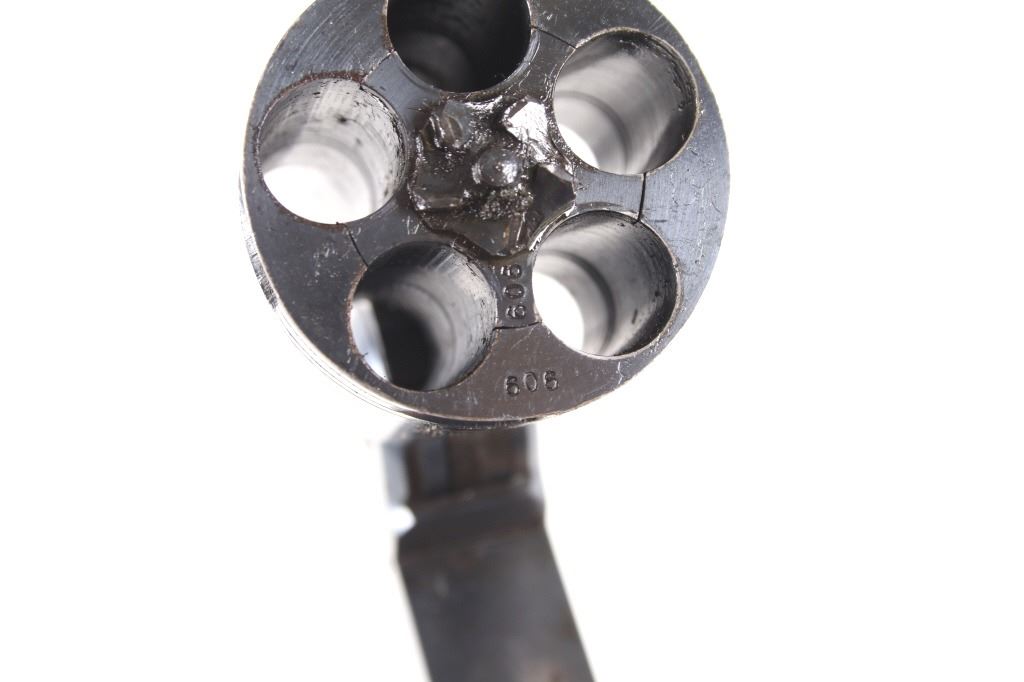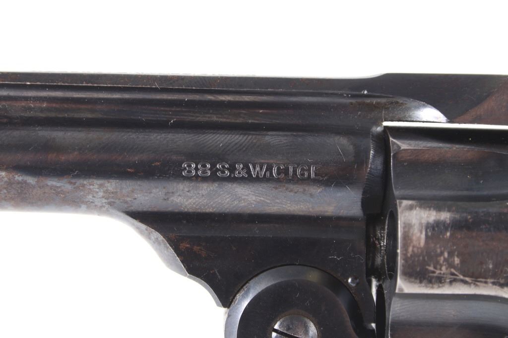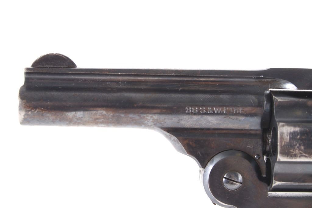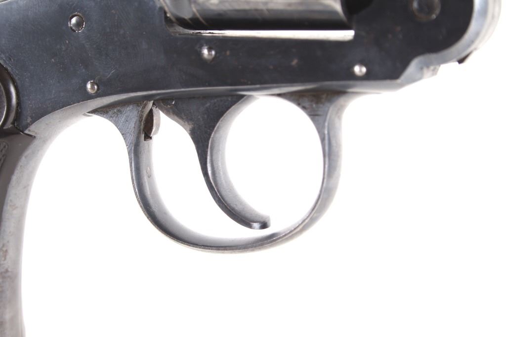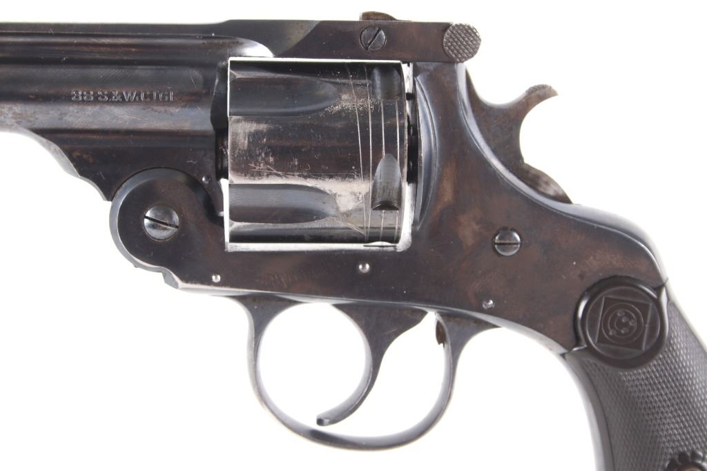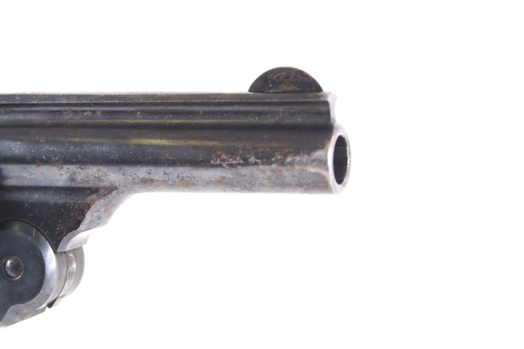 Featured in this lot we have a Harrington & Richardson double action auto ejecting top break revolver chambered in .38 S&W. This revolver displays a 3 1/4" long round ridged barrel, five shot cylinder, double action system, hard rubber grips, top break, and wonderful blue'd finish. The top of the barrel is marked reading "HARRINGTON & RICHARDSON ARMS CO WORCESTER. MASS. U.S.A." with the left side of the barrel reading "38 S.&W. CTGE.". Mechanically the revolver shows a wonderful crisp trigger and smooth cylinder timing. The revolver shows good condition overall with some expected wear due to handling and age. The pistol weighs 1lb. Serial Number: 367909. This firearm qualifies as a Curio & Relic firearm, and requires FFL Transfer or NICS Background Check.