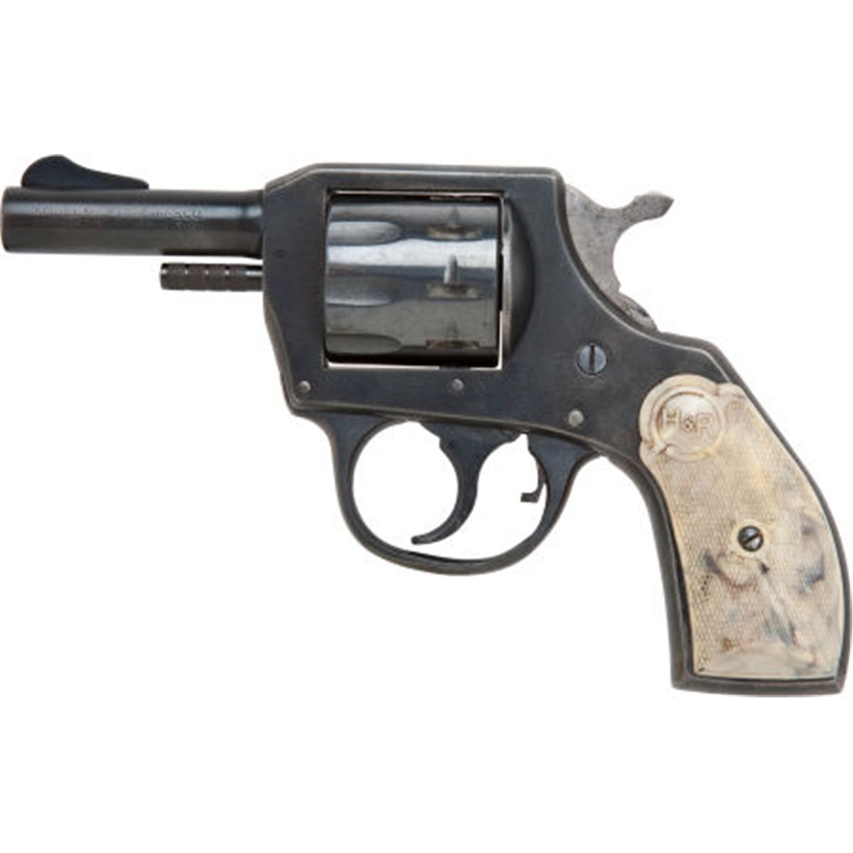 Harrington & Richardson 9-Shot Double Action Pocket Revolver. Serial no. P3657, .22 caliber, 2 1/2-inch barrel. 9-shot cylinder. Blued finish. Checkered plastic grips with H & R logo. Condition: Good as refinished. Retaining approximately 65-75% reblued finish with light pitting visible beneath blue. Grips excellent. Action good. NRA FIREARMS FOR FREEDOM PROGRAM