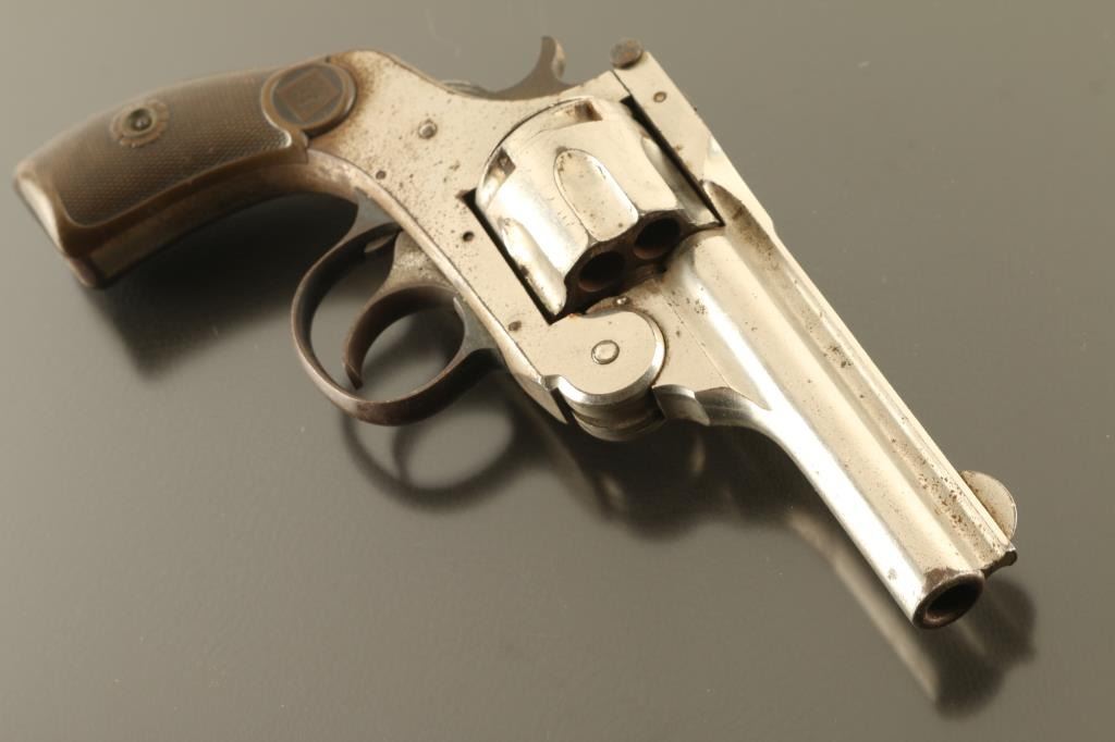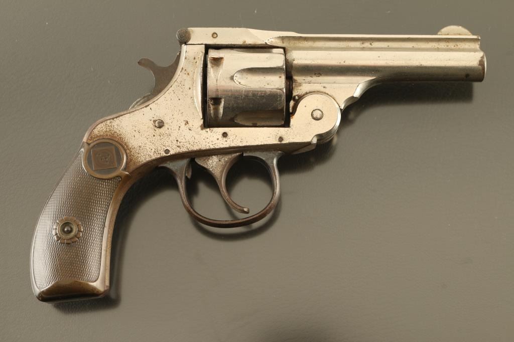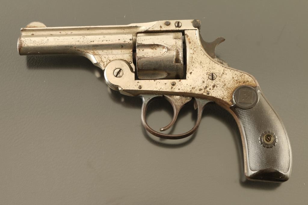 .32 S&W SN: F8719 'Second Model, Fifth Variation' 1897-1904. Double action top-break revolver. Features 3.25" barrel, nickel finish, blued triggerguard, brown hard rubber grips. Bore is poor condition, dark with traces of rifling. Nickel finish is poor overall with scattered brown patina or pitting, some peeling and flaking. Grips are faded color but solid. Action does not function. Condition is NRA Poor - needs repairs *** C&R Firearm ***