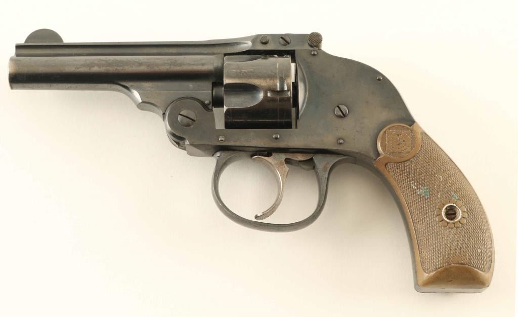 32 S&W cal, SN: 4483 Break Top. Features blued finish, checkered brown plastic grips, 3" barrel, fixed sights, 5 shot cylinder, double action only with internal hammer. Bore is very good condition. Retains 90% dark bluing, thinning on cylinder, bare metal on sharp edges. Grips are good condition, solid but appear faded in color. Action is mechanically sound. Condition is NRA Very Good *** C&R Firearm ***