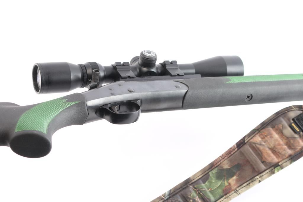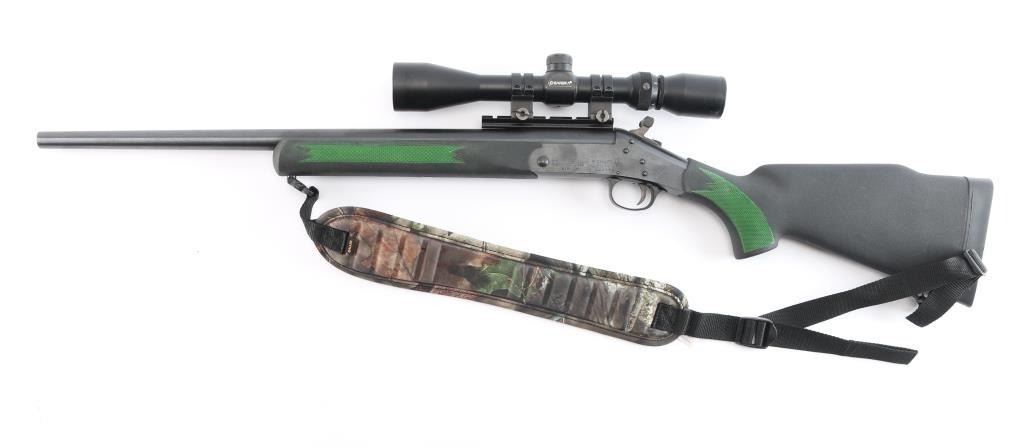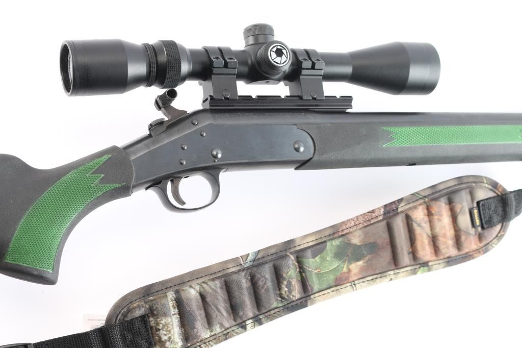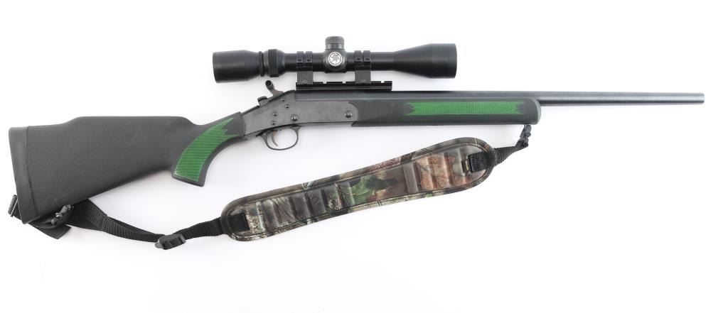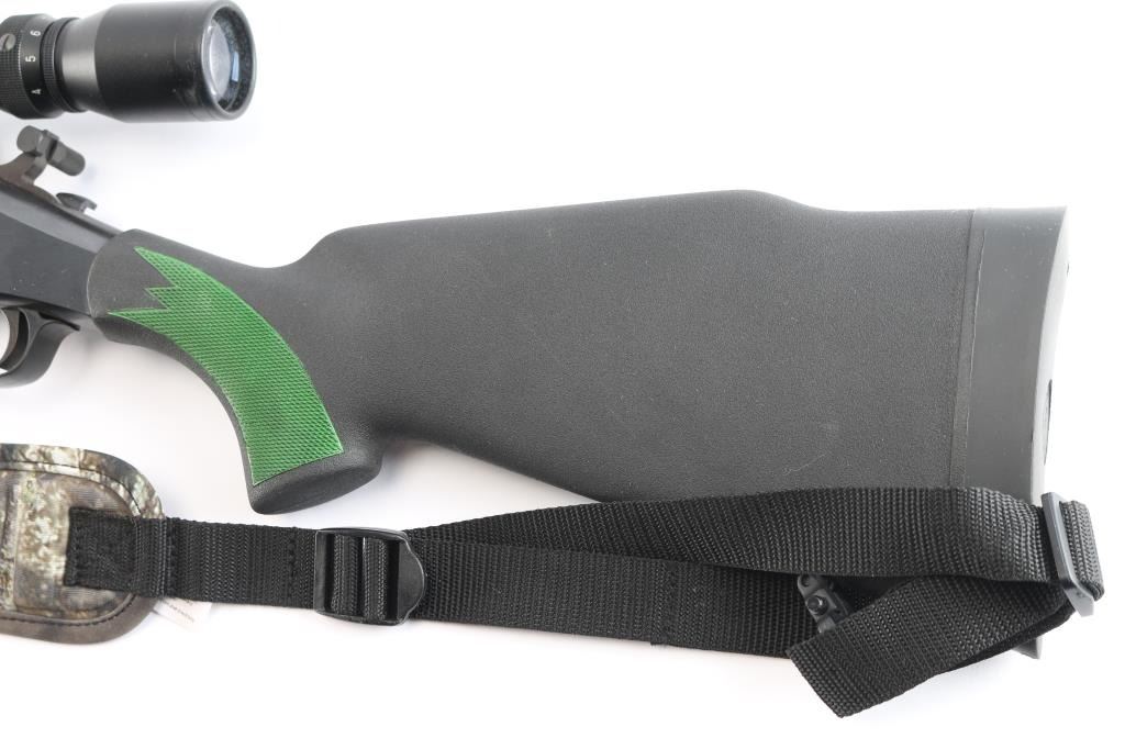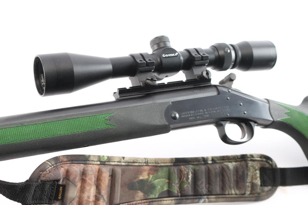 SN: CBA133449. Single shot break action rifle from H&R is chambered in .223 Remington. Blue finish. The 22" blued barrel has no provisions for sights. Black polymer stock and forend with checkered panels at wrist & forearm, (panels have been painted green) factory rubber recoil pad and attached sling swivels. Mounted with a Barska "Huntmaster" 3-9X40 scope, circle reticle, clear optics. The bore is excellent/bright, blue has a couple of very minor scratches, & the stocks is excellent. Barrel locks up tight. Allen black nylon sling with camo pad attached.