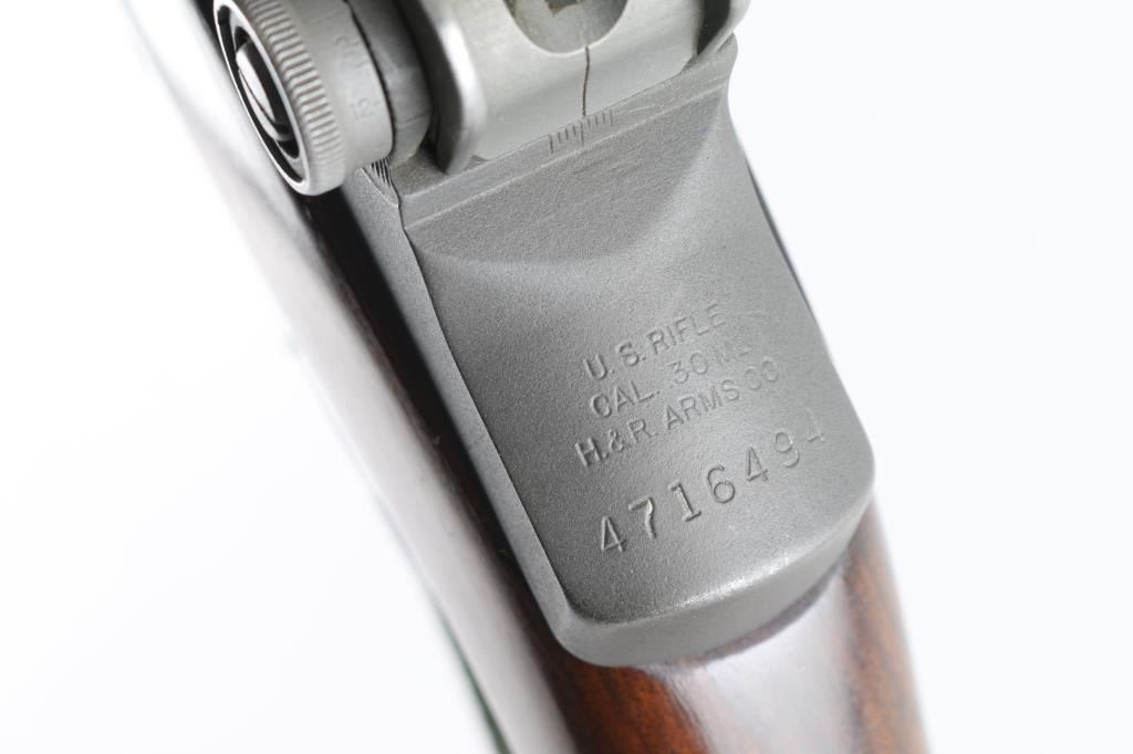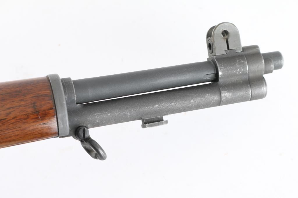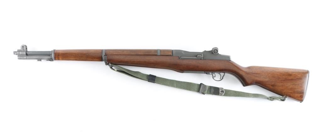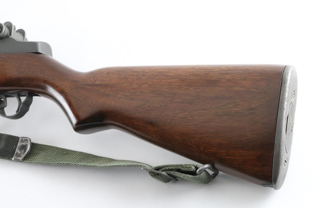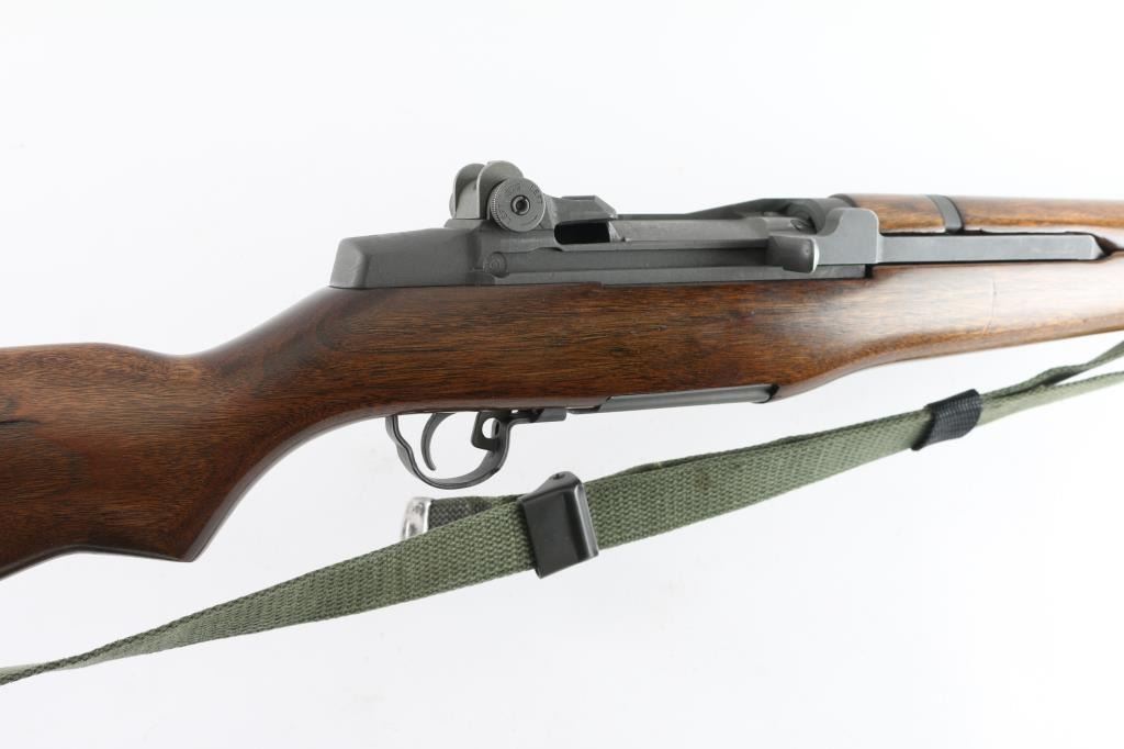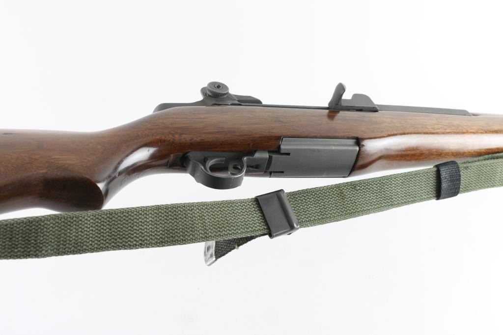 SN: 4716494 US military semiautomatic rifle manufactured circa 1953. Features parkerized re=finish, wood stock & hand guards, 24" barrel, adjustable sights with protected front blade & protected rear peep, fixed magazine for en-bloc clip, manual safety. Bore is very good condition, appears slightly dull, might improve with cleaning. Metal parts retain 95% medium gray color finish, with handling marks and edge losses. Some erosion to letters on back of receiver. Wood appears lightly sanded, finished in a semi-gloss polyurethane, i2 very good condition with a few deeper dents & dings, some loss of wood at toe. No importer marks observed. Barrel markings partially filled with thick parkerizing, appears to be an HRA barrel. Trigger housing marked "SA" Electric pencil rework marking on receiver under stock "A4 9-64". Includes green canvas sling Condition is NRA Excellent as reworked *** C&R Firearm ***