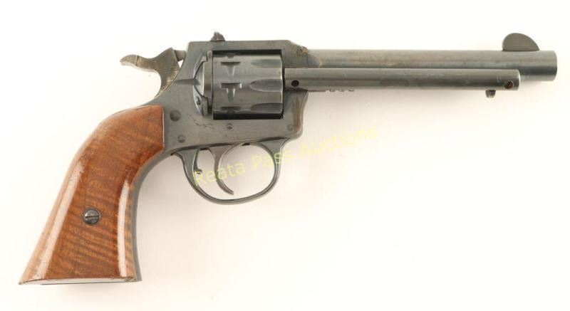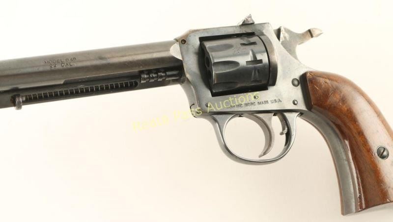 SN: AL28344 Double action nine-shot revolver chambered in .22 Short, Long or Long Rifle, circa 1961-1972. Features a blued finish, 5.5" barrel, ejector rod, blade front sight, dovetailed rear window sight, fluted cylinder, beveled trigger, serrated hammer spur, and smooth one piece wrap-around wood grips. Revolver exhibits approximately 75% of it's original finish showing thinning on the barrel, some light tooling marks on the frame and a few small areas of light surface rust scattered on the revolver. Action is smooth with good lock-up, bore is excellent and wood grips are very good with some small blemishes. Condition is good+. ***Modern Firearm***