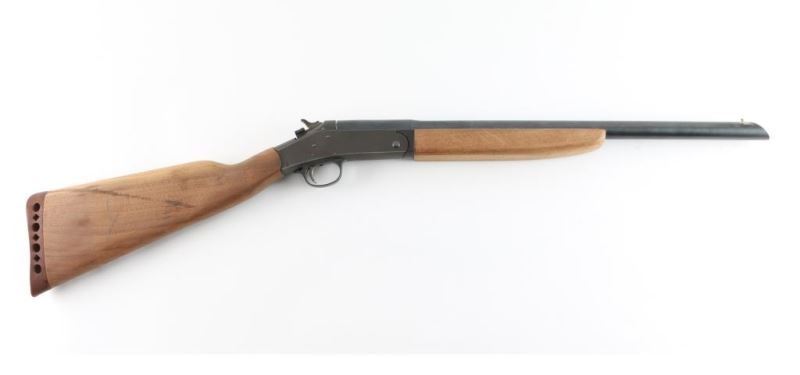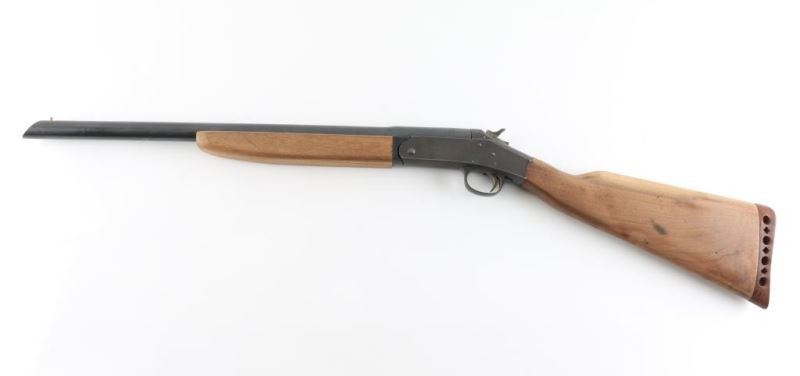 ***For Parts or Repair Only*** Single shot break open shotgun manufactured circa 1957-1961. Features blued finish, 21" barrel with angled muzzle, brass bead front sight, exposed hammer, top latch opening, smooth wood forend & straight gripped stock, ventilated rubber recoil pad. Muzzle has been cut at approx 45 degree angle. Bore is very good condition, has short brass ring installed at breech end, appears to be a field repair to correct excessive headspace. Barrel appears a later production model mismatched to this receiver. Retains 80% blue on barrel, with large area around front bead showing grind marks and bare metal. Receiver is a dark brownish gray color with traces of black paint or other finish. Wood is bare, rough textured in places, odd contour to shoulder stock in wrist area, crack in forend. Recoil pad is older vintage style, turned hard. ***Gunsmith Inspection required*** Condition is NRA Poor (chamber problems) *** C&R Firearm ***