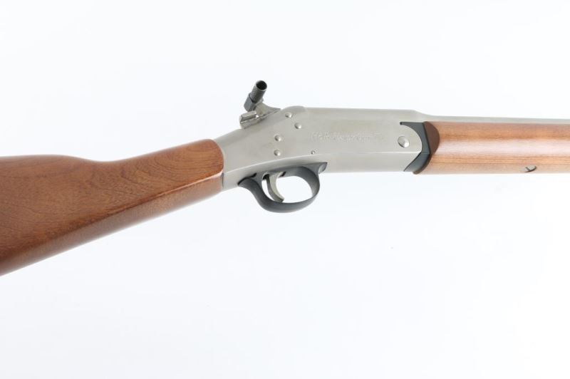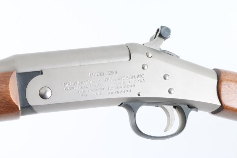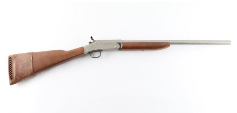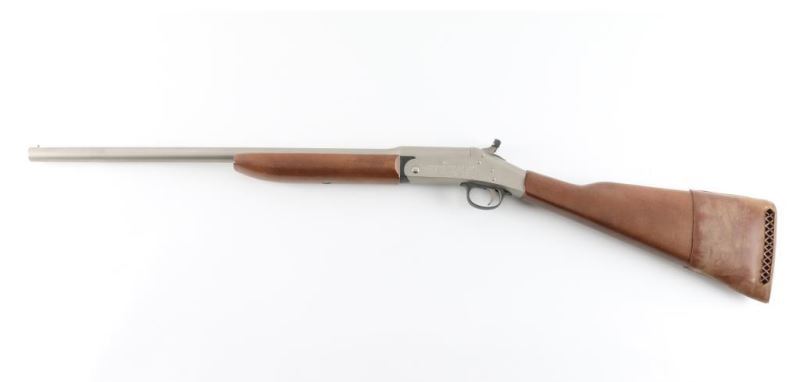 SN: BA452838 'Handy Gun II' Single shot break open shotgun features electroless nickel finish, 22" barrel, brass bead front sight, exposed hammer, top latch opening, smooth wood forend & straight gripped stock, plastic buttplate under slip-on recoil pad (not removed for inspection). Accepts 3" shells, MOD choke. Bore is very good condition. Retains 90% finish with some blemishes. Wood is very good with few blemishes, dents. Includes hammer extension. Condition is NRA Very Good++ *** Modern Firearm ***