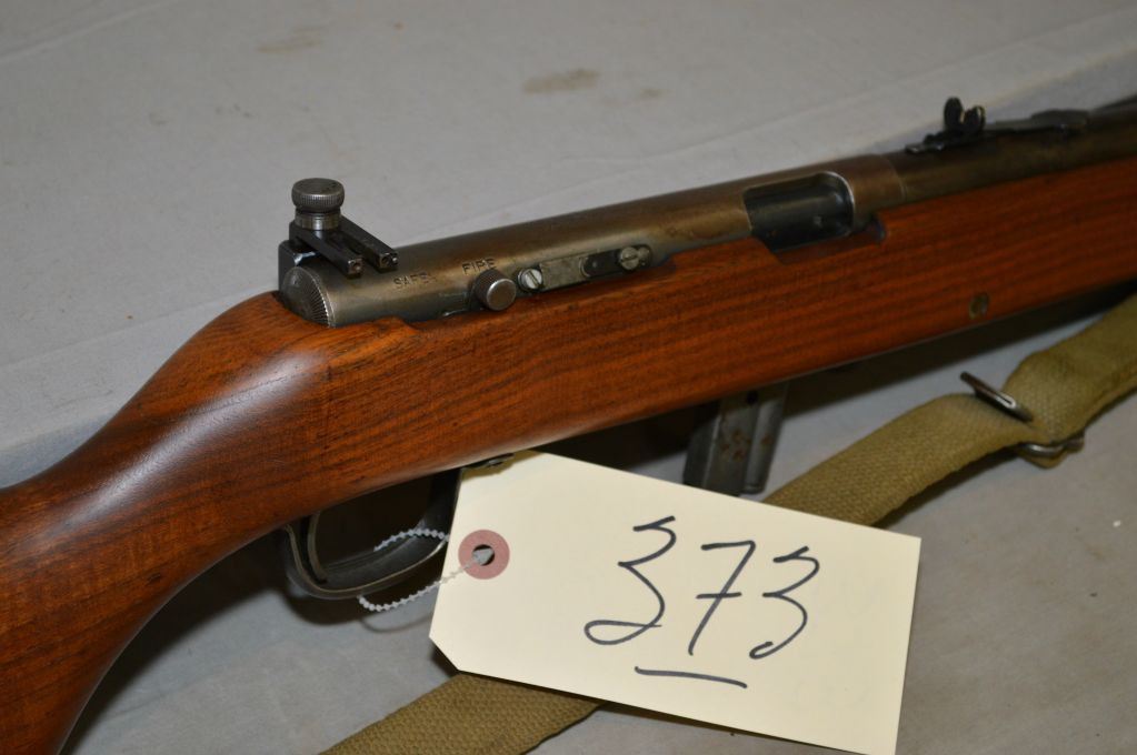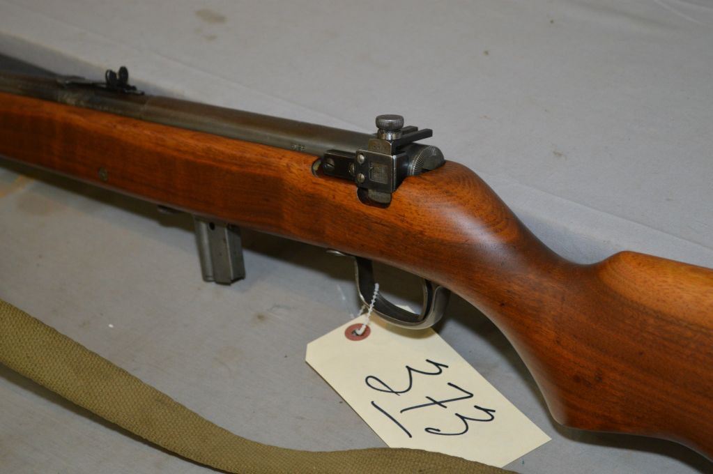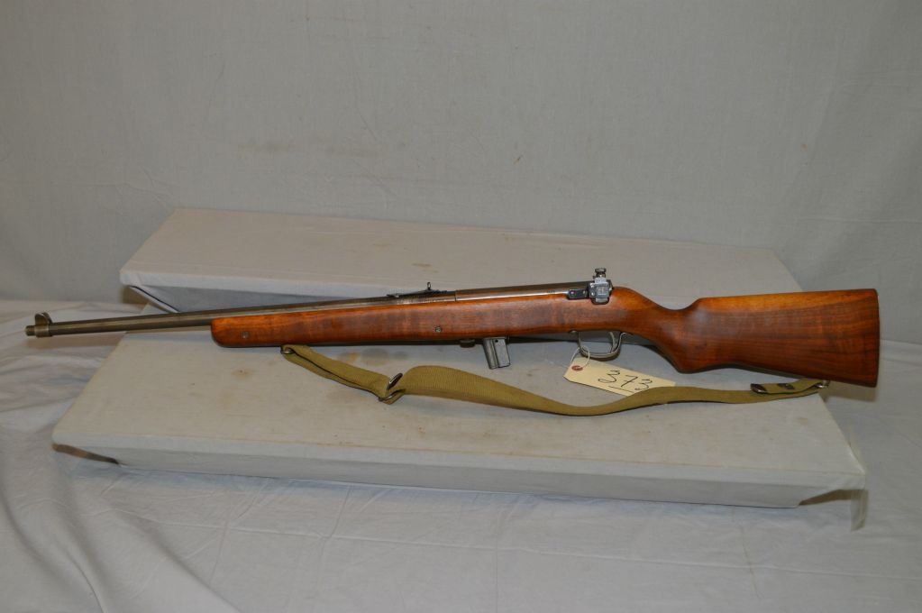 Harrington & Richardson Model 65-H .22 LR Cal Mag Fed Semi Auto Rifle w/23 1/4" bbl [ traces of blue, faded to grey in some areas, Marbles back sight, also part of Redfield peep sight, cocking mechanism in hole in bottom of the forend, web sling, metal butt plate ] Ser # 8128