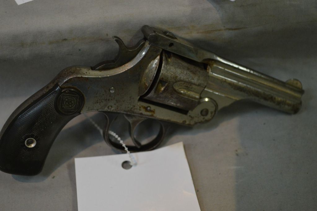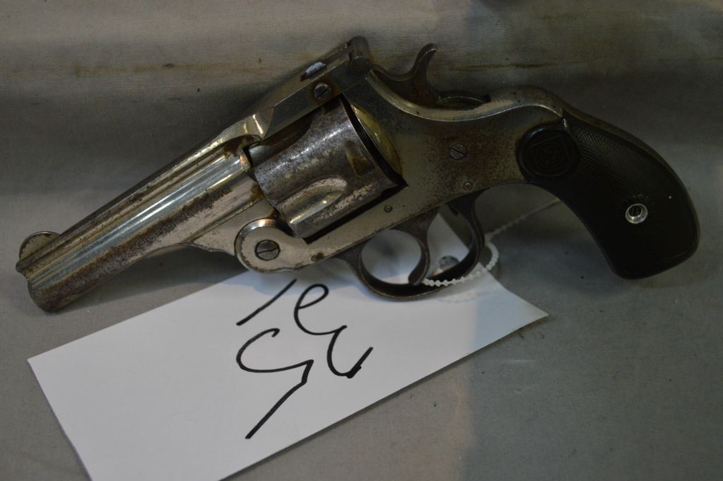 Harrington & Richardson Model Automatic Ejecting .38 S & W cal 5 Shot Revolver w/ 83 mm bbl [ fading & flaking nickel finish, good checkered grips ] Ser # 138597 Prohib Cert # 18293950