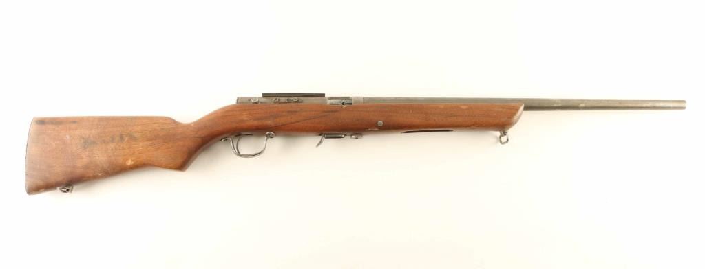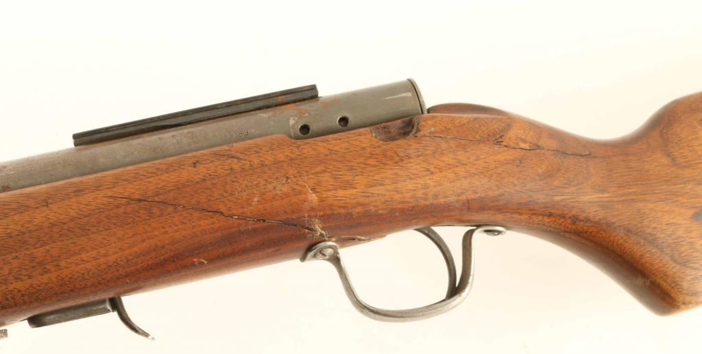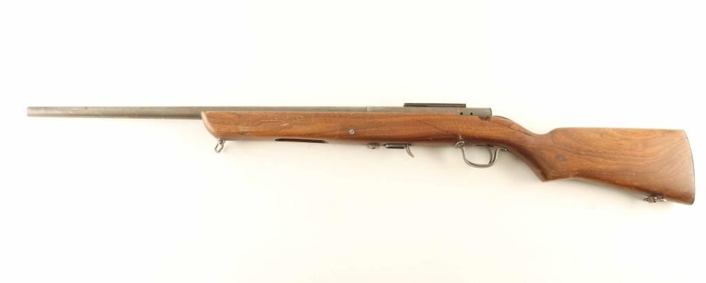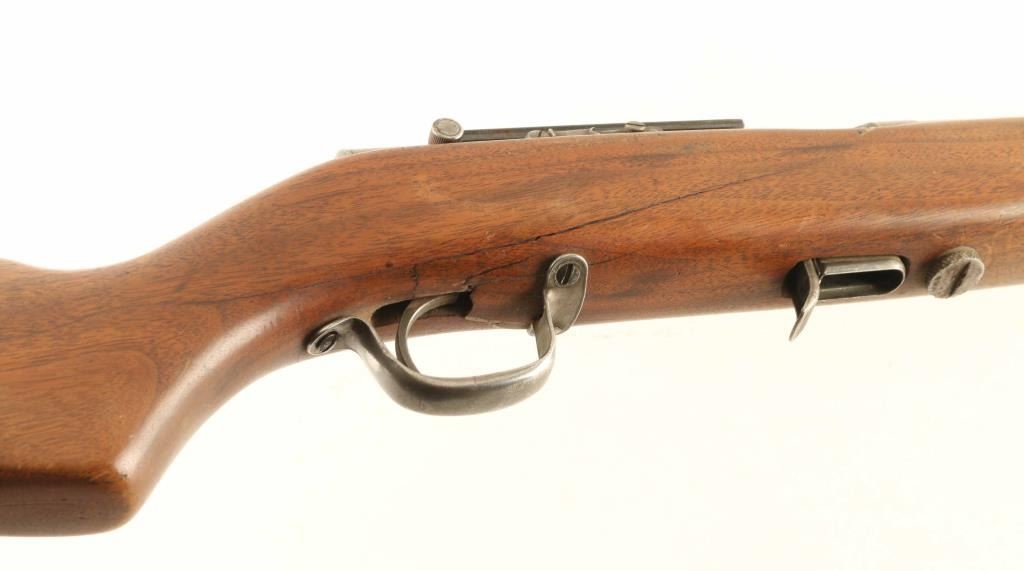 SN: 2283 Semi auto magazine fed rimfire rifle features parkerized finish, plain pistol grip walnut stock, 22" barrel, sling swivels, no front sight (possibly due to barrel cut-down), no rear sight, manual safety, dovetail rail mounted to top of receiver, accepts detachable magazines, pushbutton cocking bar inside stock under rear of barrel. Bore is very good. Metal surfaces retain 50% finish, appears thinly applied, with patina or rust visible in many places, buttplate in particular shows much rust. Wood is poor condition with many cracks a wrist and under action, many scratches, loss of finish all around butt at plate. Action needs repair - does not seem to fire. No magazine provided. Condition is NRA Poor (need repair, no magazine) *** C&R Firearm ***