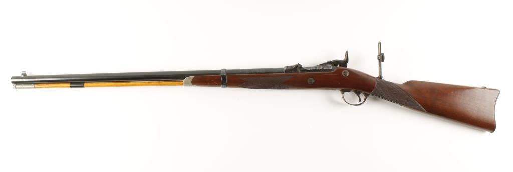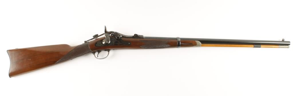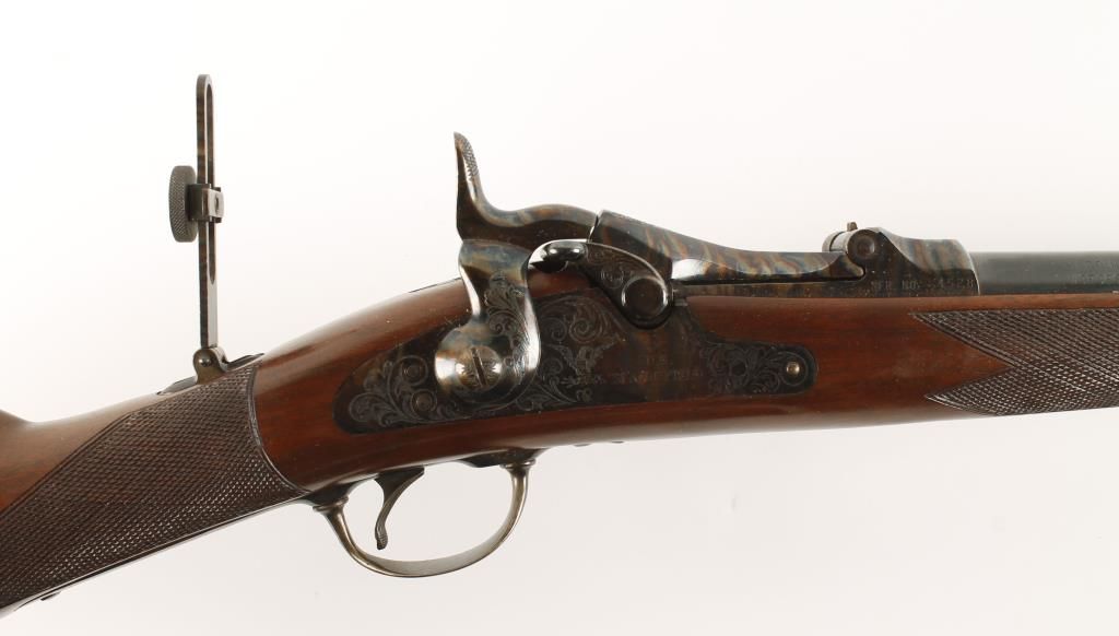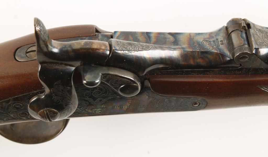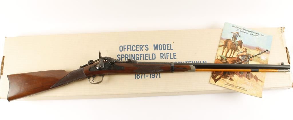 Reproduction of the Springfield 1873 Trapdoor. Barrel and band are blued. Receiver, hammer, butt plate, rear tang sight and trigger guard are color case hardened. 26" barrel. Light engraving on barrel band receiver , lock plate, breech block, hammer and trigger guard. Wooden ramrod. Stock is checkered at the wrist and on the forearm. Includes original box and H&R 1971 catalog. Condition: Like New in Box *MUST BE REGISTERED*