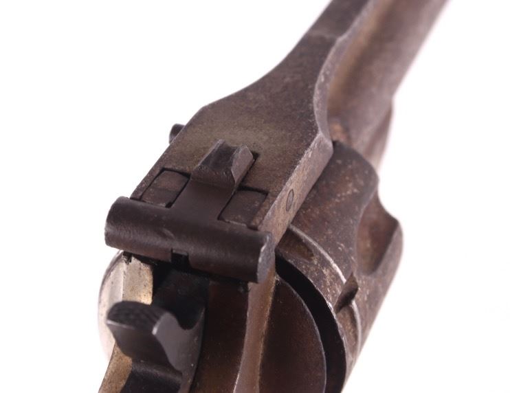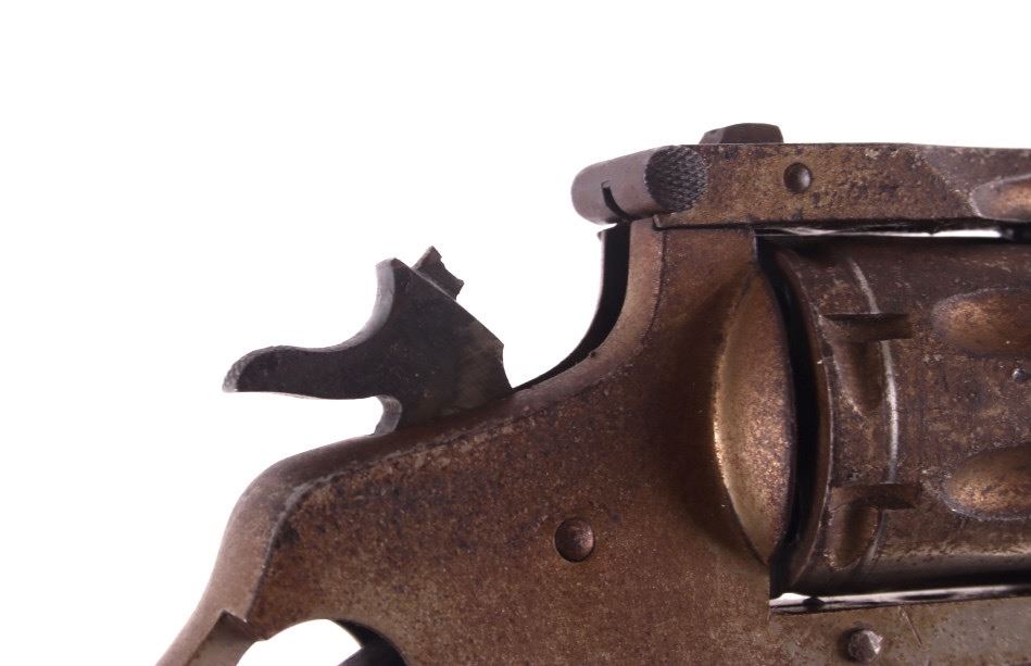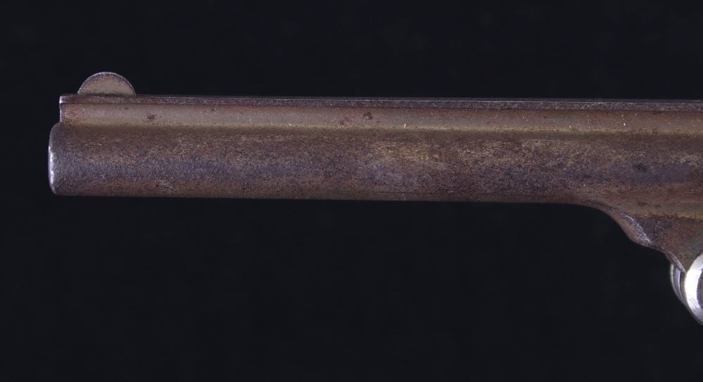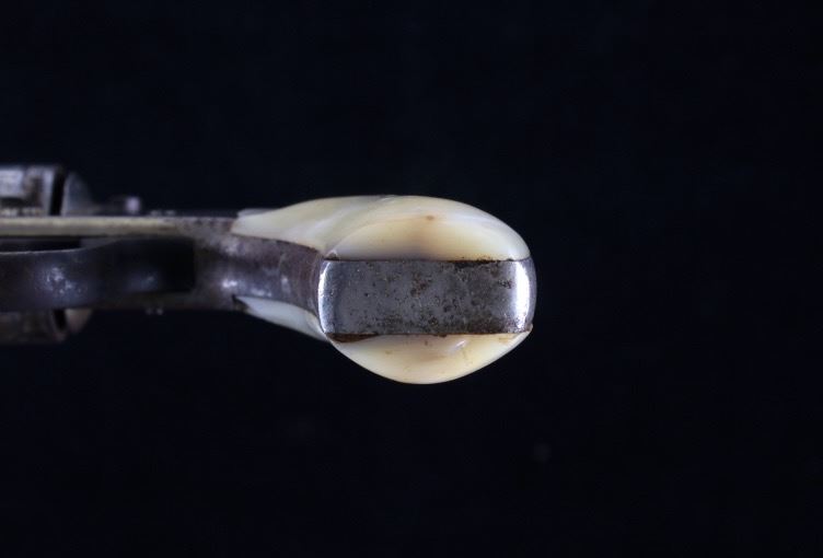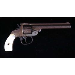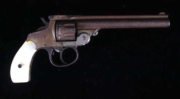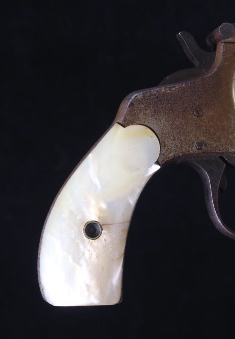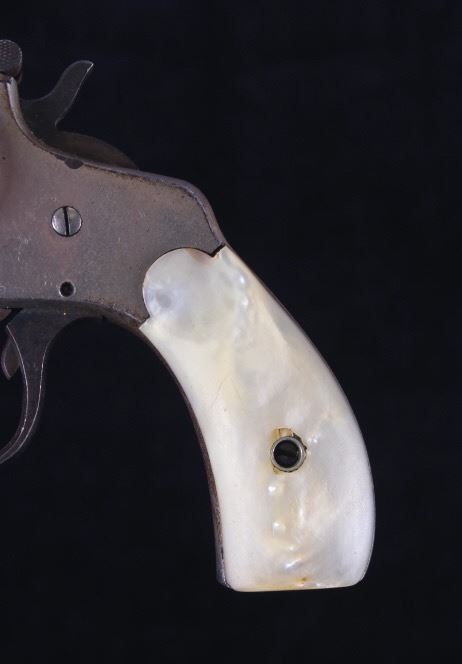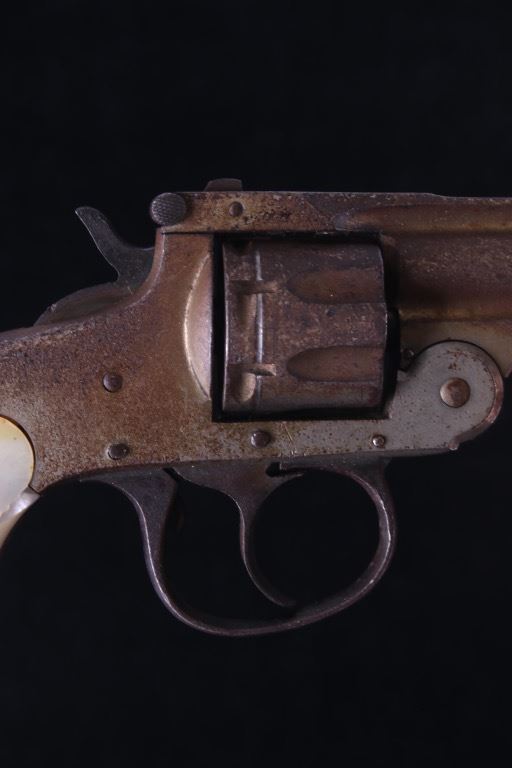 For sale in this lot we have a Harrington & Richardson Hammerless double action revolver chambered for a .22 caliber. The revolver features a 5" barrel, seven shot break top cylinder, mother of pearl grips, nickel finish, and fixed sights. The revolver is marked "HARRINGTON & RICHARDSON ARMS COMPANY - WORCESTER. MASS. U.S.A. PAT. OCT. 4. 87. APR. 2. 95. APR. 7. 96." on the top of the barrel. The revolver shows okay condition overall, the nickel finish is in good shape on the frame and the barrel has developed a full patina. The bore shows deep rifling and also some pitting. This revolver fires as a single action and will need work for the double action to work properly. Serial Number: 7439. This firearm qualifies as a Curio & Relic Long Gun, and requires FFL Transfer or NICS Background Check.