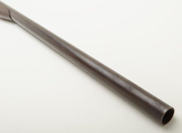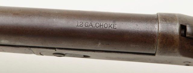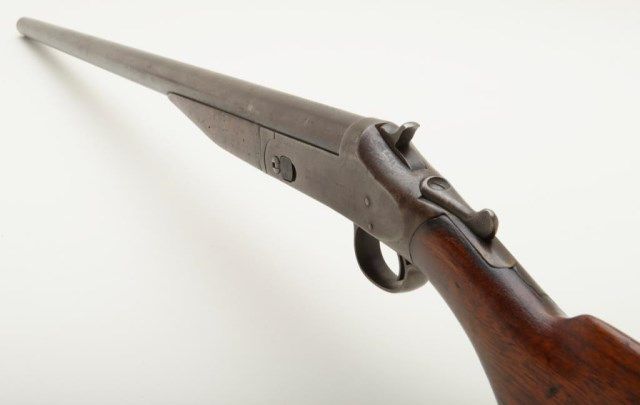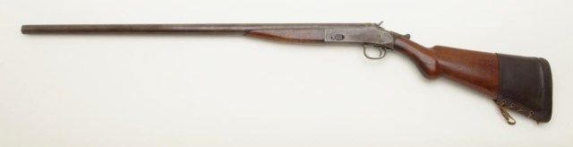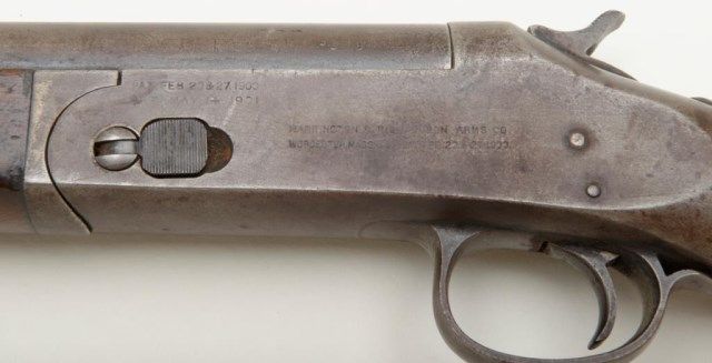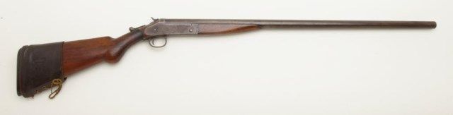 Harrington and Richardson 12 gauge single shot exposed hammer shotgun in fair condition showing 29” barrel, serial number A61373. The metal surfaces show a gray to brown patina finish with traces of original blue. The action works well and the gun locks up tight. The bore is slightly rough. The barrel appears to have been shortened about an inch and there is no front sight bead. The stocks are good other than stress cracks in the wrist area which are minor. The original butt plate is retained. Est.: $100-$200