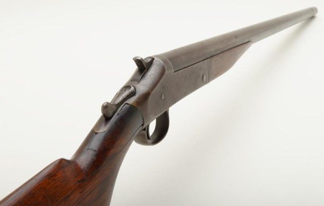 Harrington and Richardson 12 gauge single shot exposed hammer shotgun in fair condition showing 29” barrel, serial number A61373. The metal surfaces show a gray to brown patina finish with traces of original blue. The action works well and the gun locks up tight. The bore is slightly rough. The barrel appears to have been shortened about an inch and there is no front sight bead. The stocks are good other than stress cracks in the wrist area which are minor. The original buttplate is retained. Est.: $100-$200