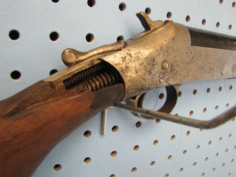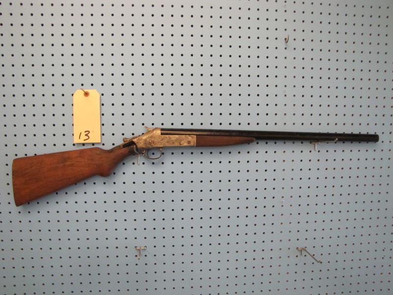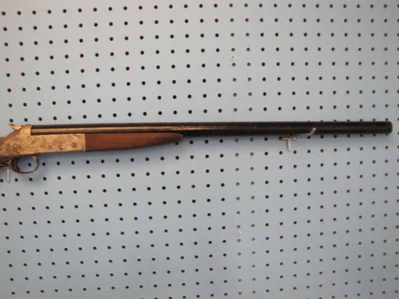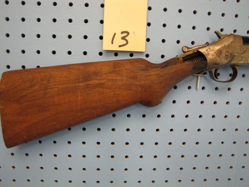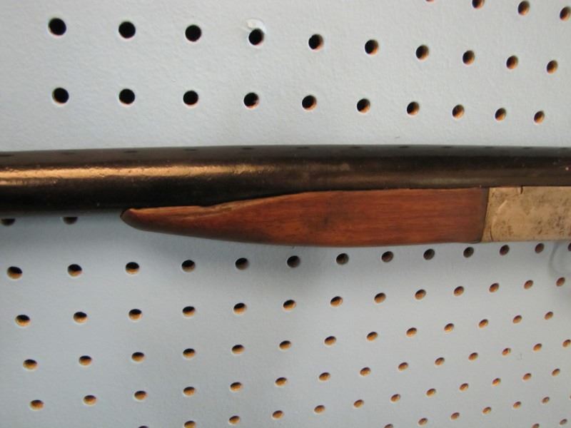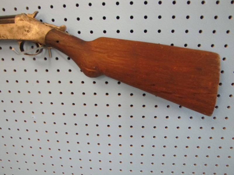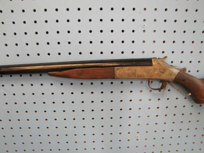 Harrington and Richardson 12 gauge single shot exposed hammer stock broke at receiver cut down to 24 inch barrel receiver pitted Barrel painted black