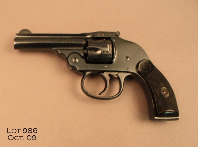 Harrington and Richardson DA hammerless revolver, .32 S&W cal., 3” barrel, blue finish, checkered black plastic grips, #271558. This gun is in overall fine condition showing approx. 98% original finish, crisp action, sharp markings,fine bore, fine grips. Est.: $200-$400.