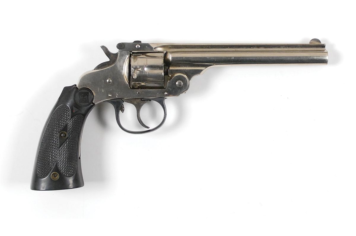 Serial no. 321657, caliber .22 rimfire. This is a fourth variation that is not “PREMIER” marked. It has a 5? barrel with a very good bore. The metal retains 95% nickel plated refinish with a blued triggerguard. The cylinder has fine scratches and one small spot of corrosion. The hard rubber grips are the factory extended target version. They have a small chip at the backstrap (the piece is included) and the checkering is in excellent condition. This revolver is in a homemade wood case with a pasted-in label from an H & R “PREMIER” box. Also included is a metal “Perfect Pocket Oiler.” The revolver works well. This transfers as a modern firearm.