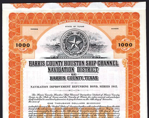 Texas. $1000 Specimen 1 1/2% Navigation Improvement Refunding Bond, Vertical format with Coupons attached. Black ink with orange border and under print. Vignette of State seal at top center flanked by ocean. Specimen overprints, POC's, SBNC. VF