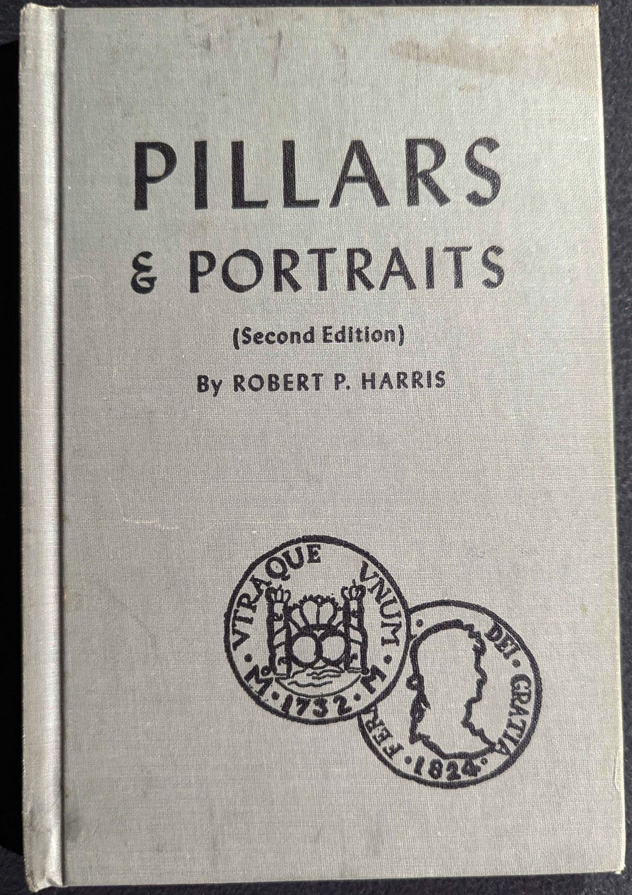 Harris, Robert P. PILLARS AND PORTRAITS. Bonanza Press. 1969. 12mo. (2), 112, (2) pages. Cupertino. original grey cloth, lettered in black. b&w plated throughout. Very Good. Addendum pasted in. This book is an illustrated price catalog and numismatic history of the coinage minted within the Spanish American Colonial Empire. It contains listings and valuations of all known denominations, dates, assayers by mint, of die struck, milled edge, silver coins produced at Spanish mints in the Americas during the period 1732 to 1826. Lot weight: 0 lbs 9oz. Subject(s): Latin American Coinage.