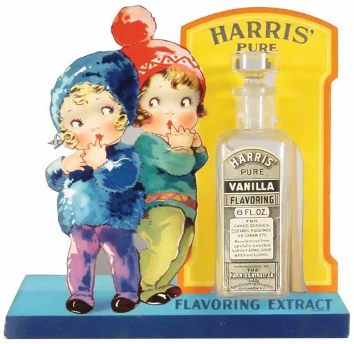 Harris' Pure Flavoring Extract Cardboard Easelback Counter Display. Comes with original Harris' Vanilla Flavoring bottle with paper labor. Overall excellent condition. 8 X 8 X 2 1/2 inches.