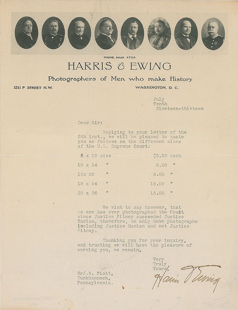 Photographic studio in Washington, D.C., opened in 1905 by George W. Harris and Martha Ewing. Today, the Library of Congress preserves 700,000 glass and film negatives in their Harris & Ewing Collection. TLS, signed in an unknown hand, one page, 8.5 x 11, Harris & Ewing portraiture letterhead, July 10, 1913. Letter to a prospective customer, offering prices ranging from $3.50 to $15 on enlarged photos of the US Supreme Court. In part: “We wish to say, however, that no one has ever photographed the Court since Justice Pitney succeeded Justice Harlan, therefore, we only have photographs including Justice Harland and not Justice Pitney.” Central vertical and horizontal folds, and mild scattered creases and soiling, otherwise fine condition. An exceptional piece of photographic history.